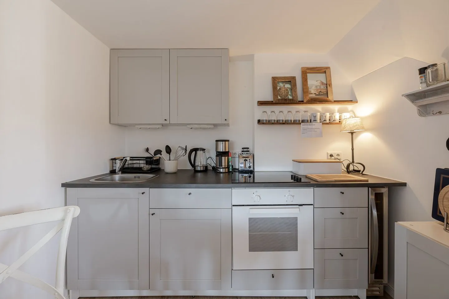 Die offene Küche fügt sich ganz selbstverständlich ein und ist vollständig ausgestattet – vom Ceranfeld über Backofen und Spülmaschine bis hin zu Kaffeemaschine, Toaster und allem, was man im Alltag braucht. Hier beginnt der Tag vielleicht mit einem Kaffee in Ruhe – und endet genauso entspannt wieder.