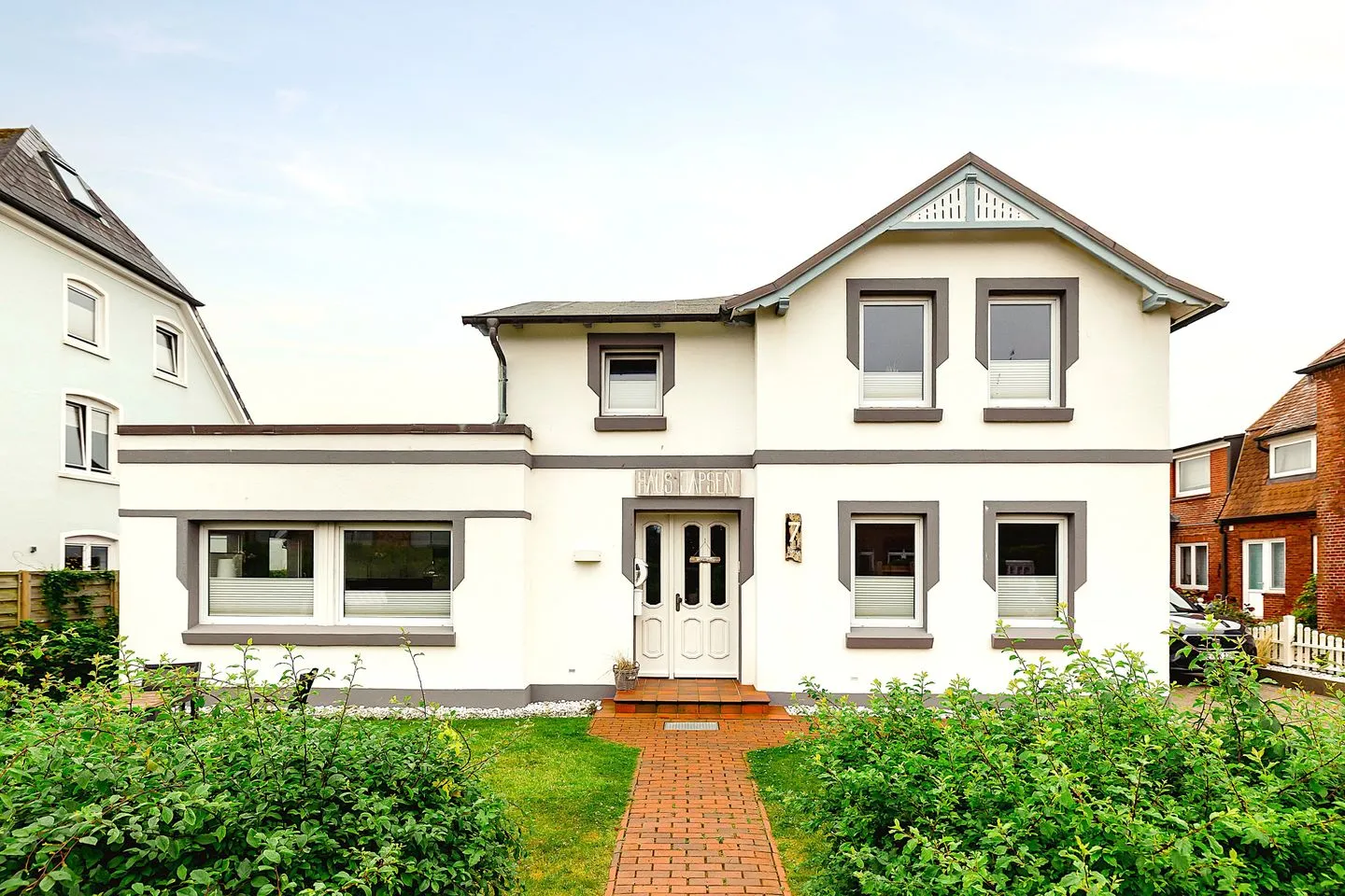 Ein weiteres Highlight ist der Gartenbereich, auf dem sich sowohl Gartenmöbel als auch ein Strandkorb befinden. Genießen Sie die frische Meeresbrise und lassen Sie den Blick über den schön angelegten Garten schweifen.