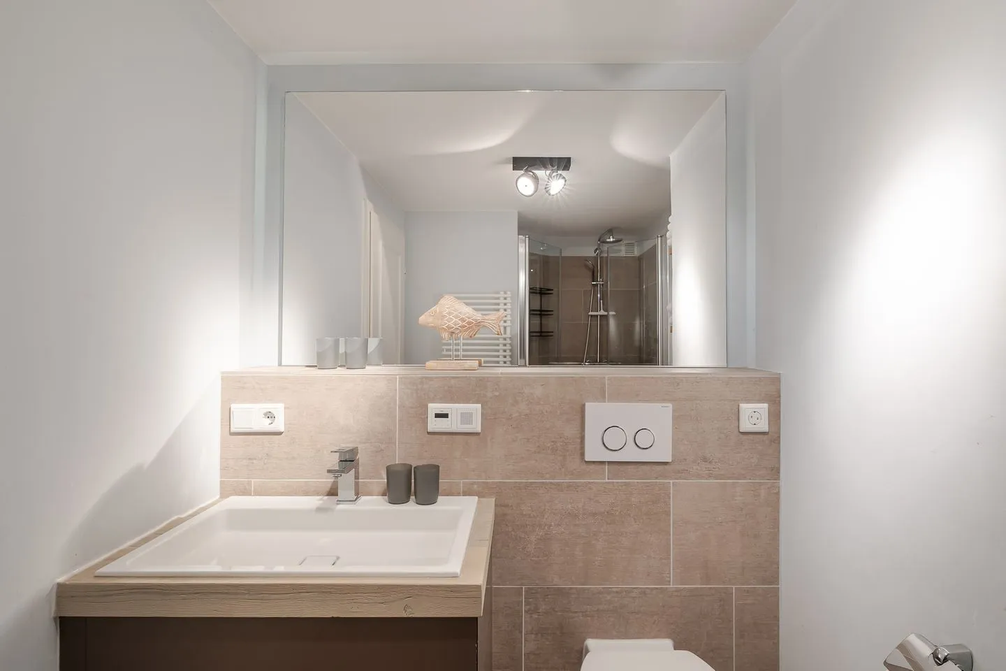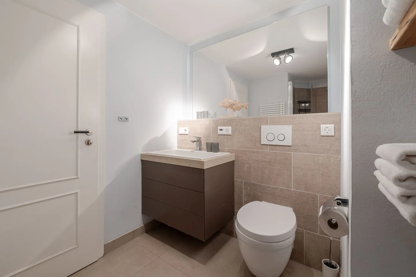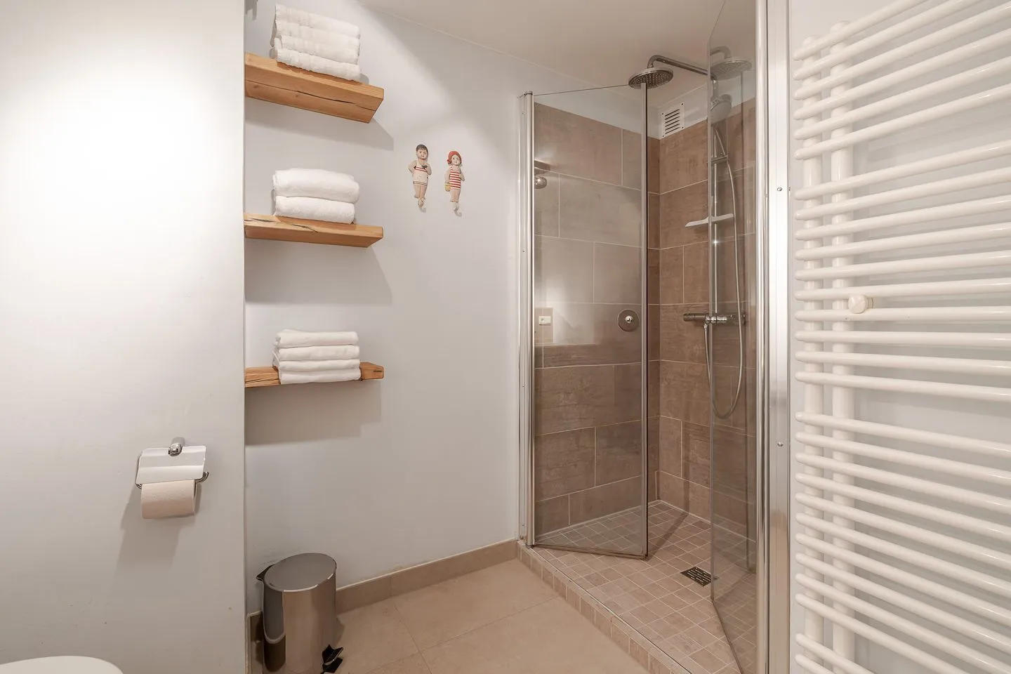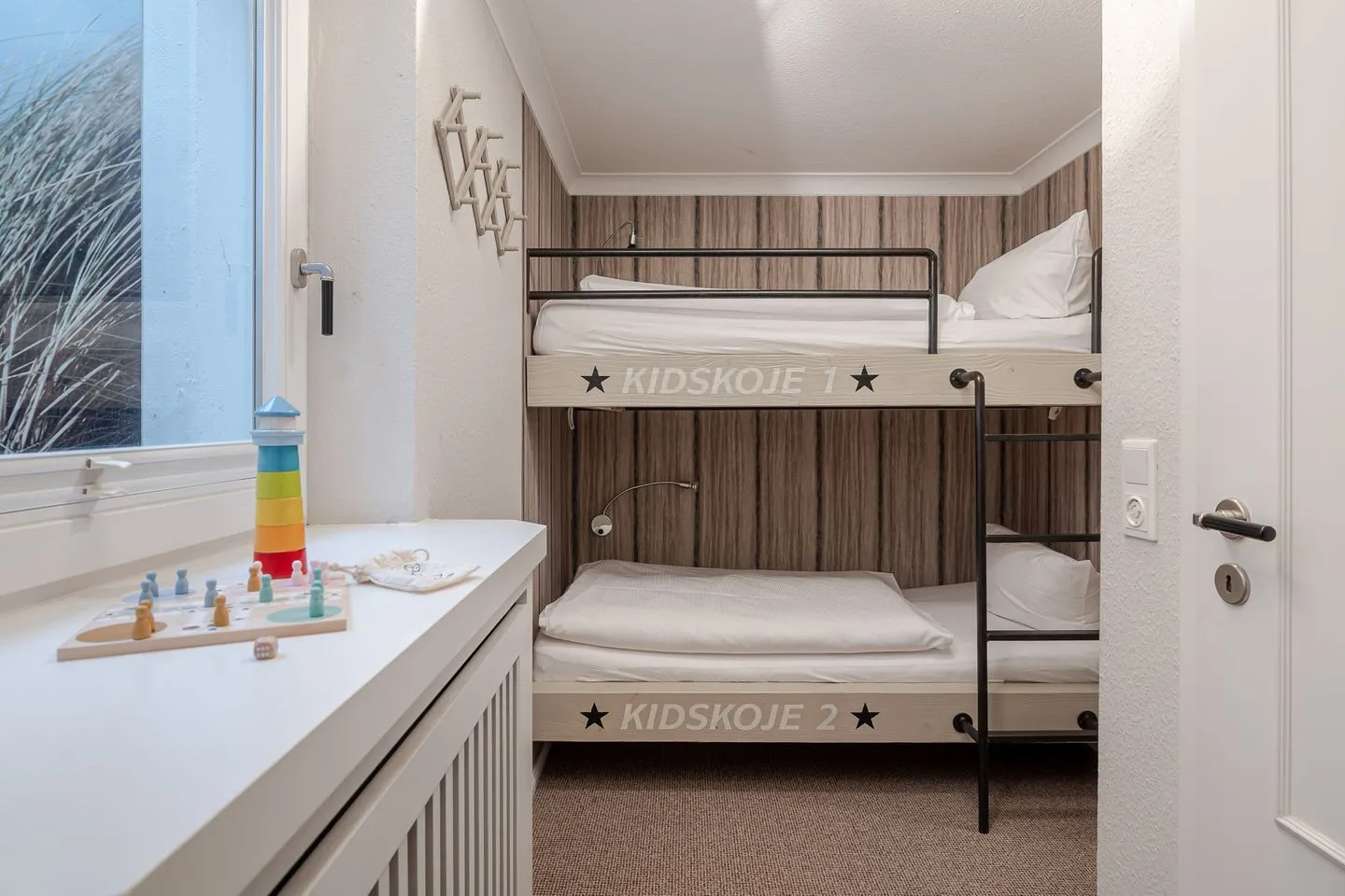 Die beiden Schlafzimmer im Untergeschoss liegen angenehm ruhig. Ein Schlafzimmer mit Doppelbett, ein weiteres mit Etagenbett – klar, gemütlich und bewusst zurückhaltend, damit man gut abschalten kann. Das Badezimmer ist modern und hochwertig ausgeführt und fügt sich stimmig in das Gesamtbild der Wohnung ein.