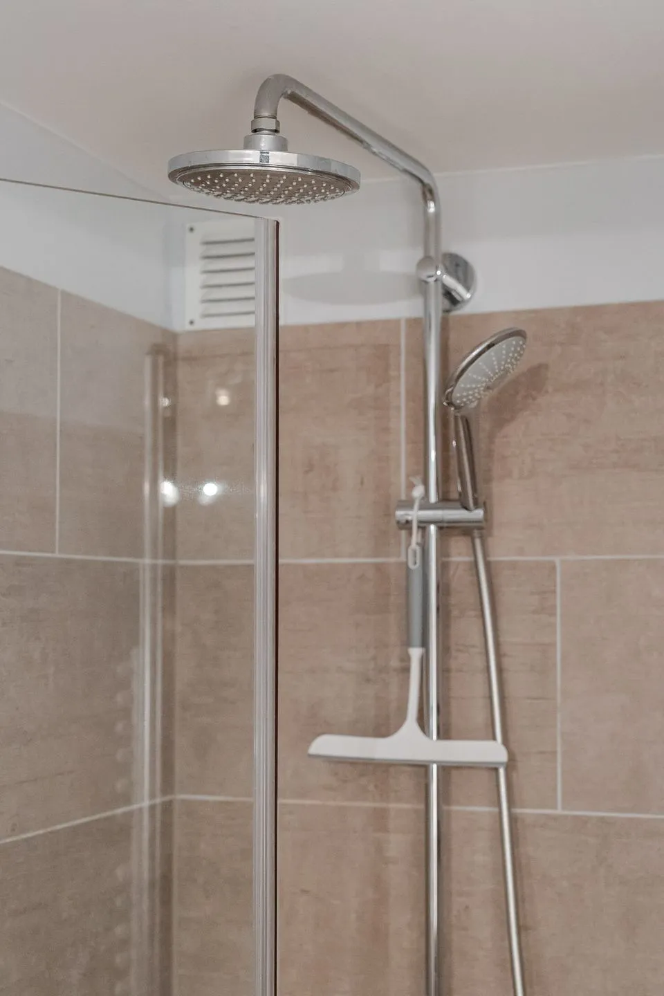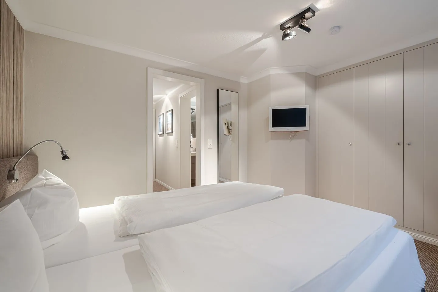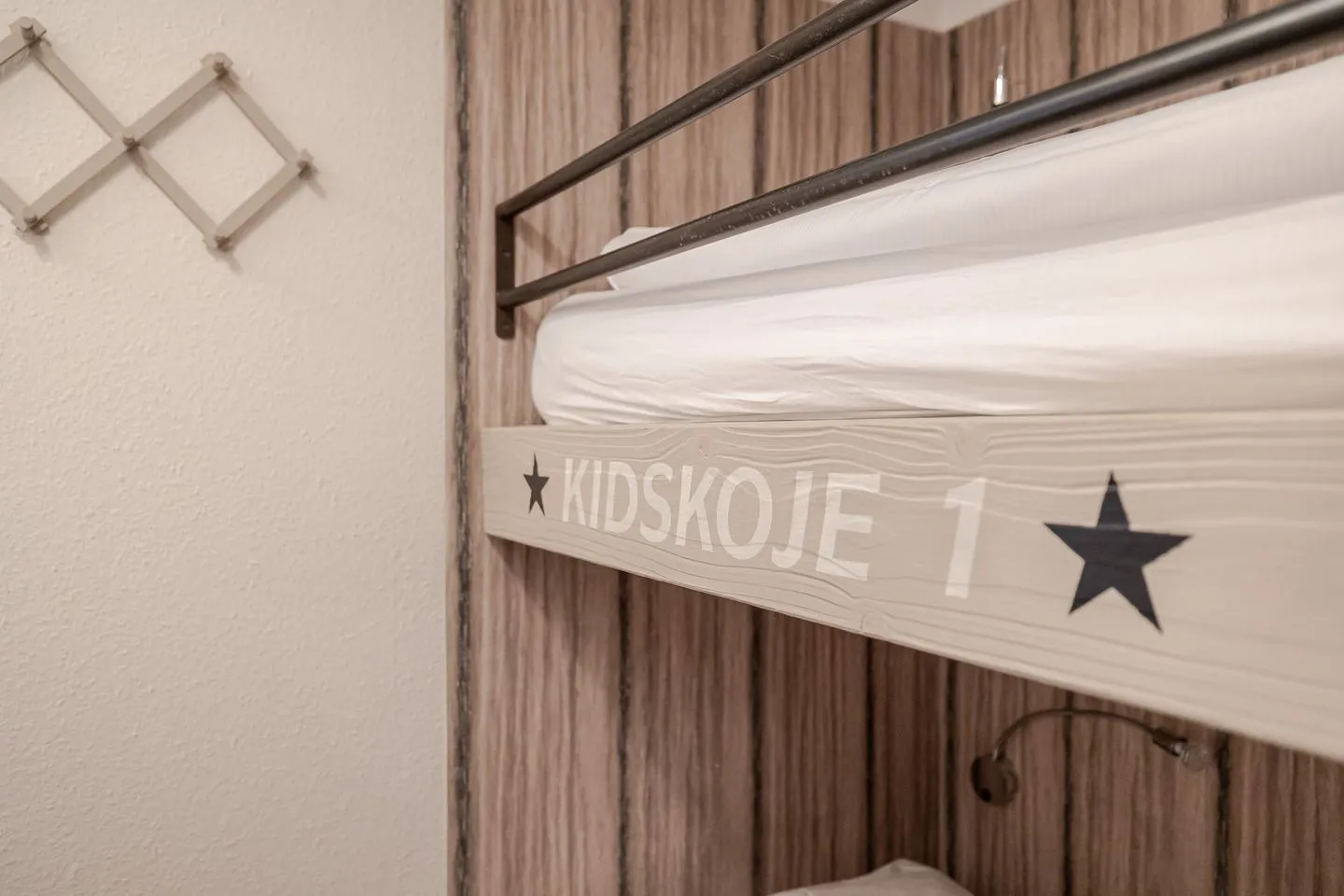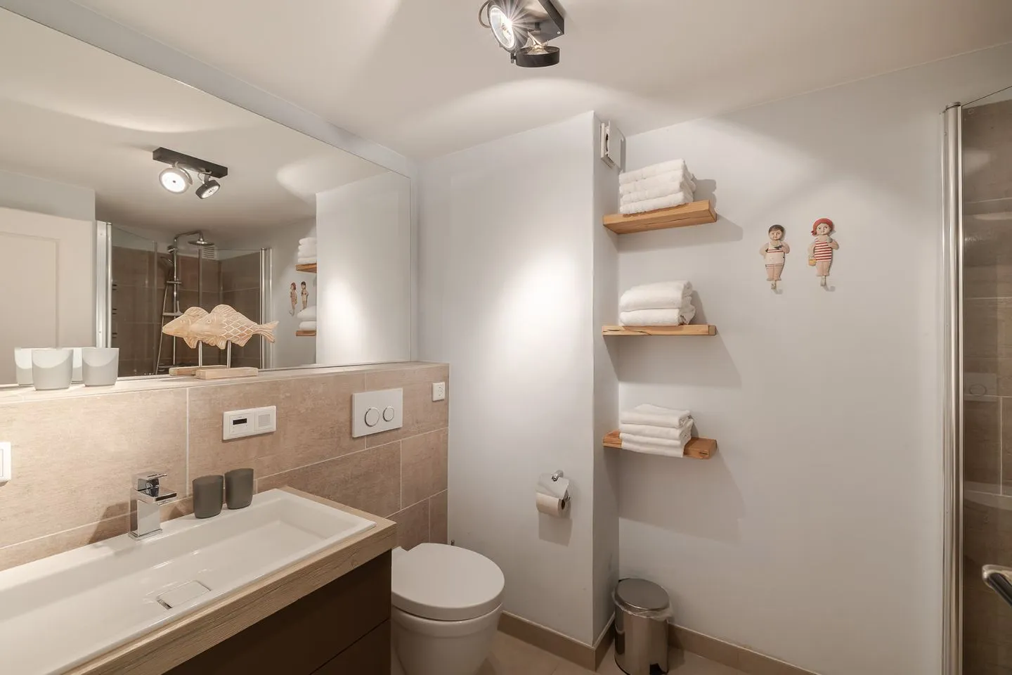 Die beiden Schlafzimmer im Untergeschoss liegen angenehm ruhig. Ein Schlafzimmer mit Doppelbett, ein weiteres mit Etagenbett – klar, gemütlich und bewusst zurückhaltend, damit man gut abschalten kann. Das Badezimmer ist modern und hochwertig ausgeführt und fügt sich stimmig in das Gesamtbild der Wohnung ein.