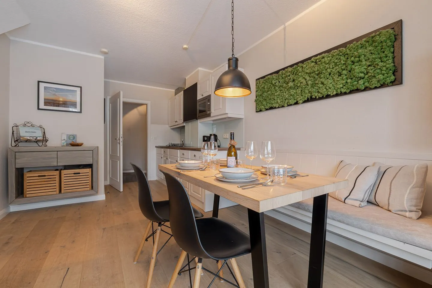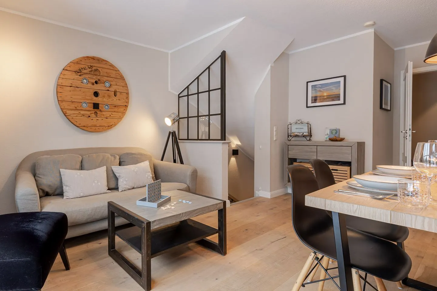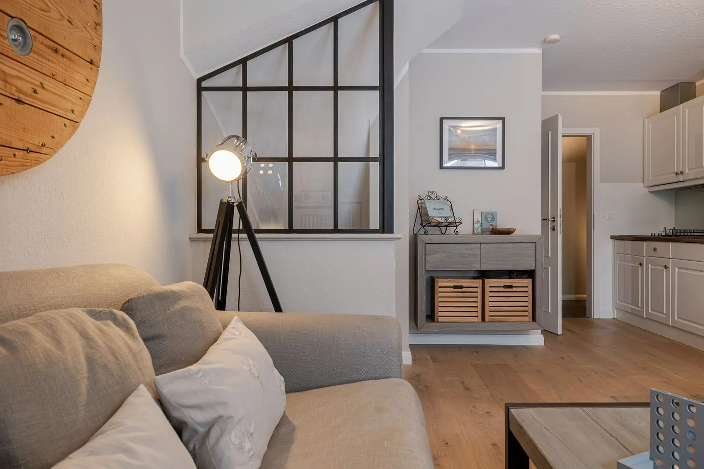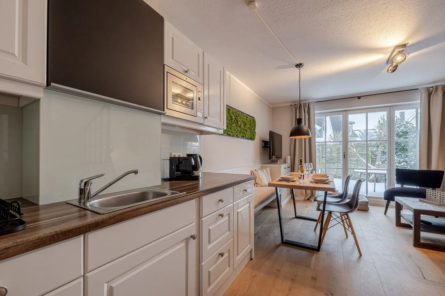 Auf zwei Ebenen und rund 60 m² bietet das Küstennest Raum für bis zu vier Personen. Der Wohnbereich ist offen, lichtdurchflutet und genau der richtige Ort für gemeinsames Ankommen – morgens mit Kaffee, nach einem Strandtag oder in den ruhigeren Abendstunden. Die Küche ist vollständig ausgestattet und selbstverständlich Teil des Raumes, funktional und hochwertig, ohne den Wohncharakter zu verlieren.