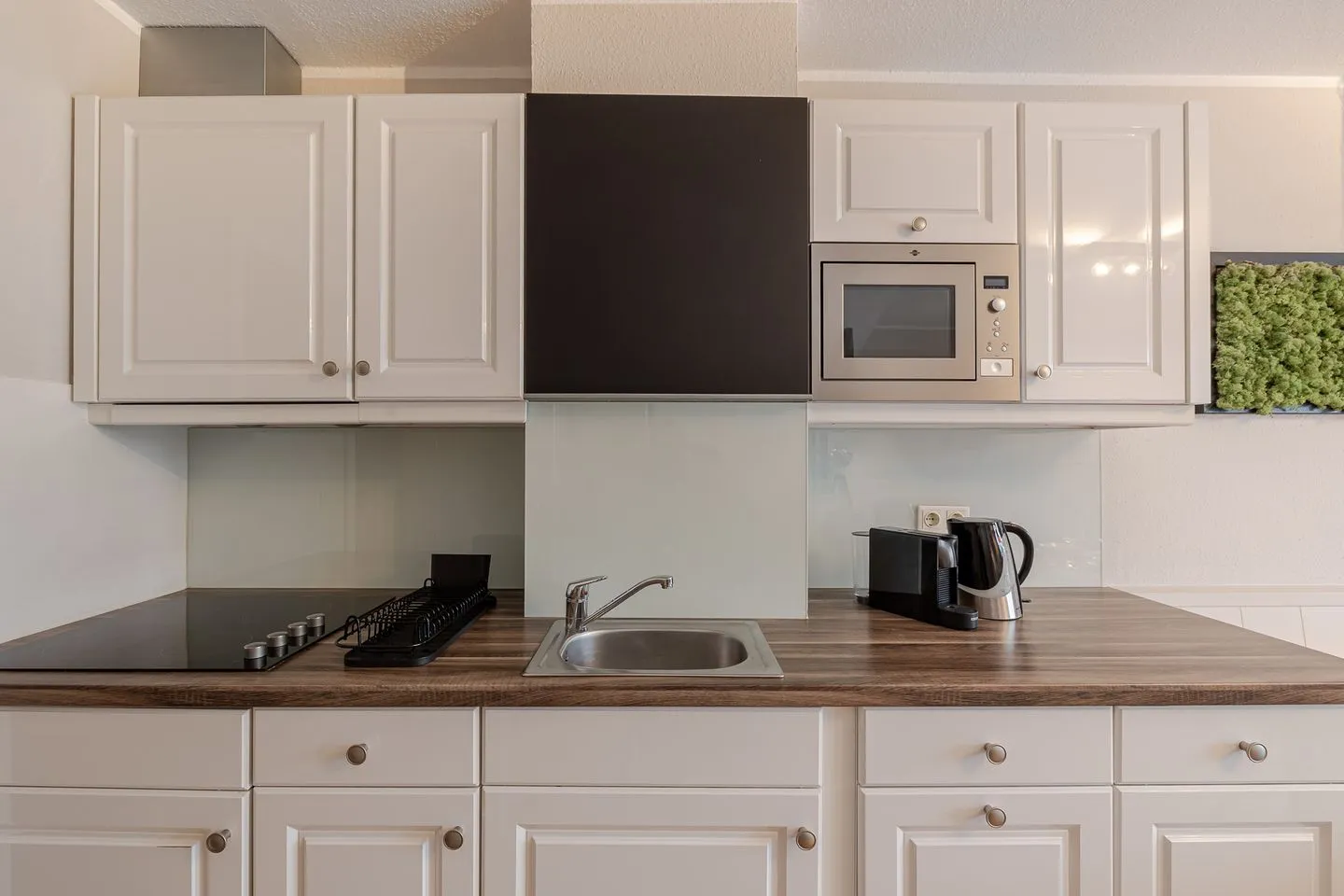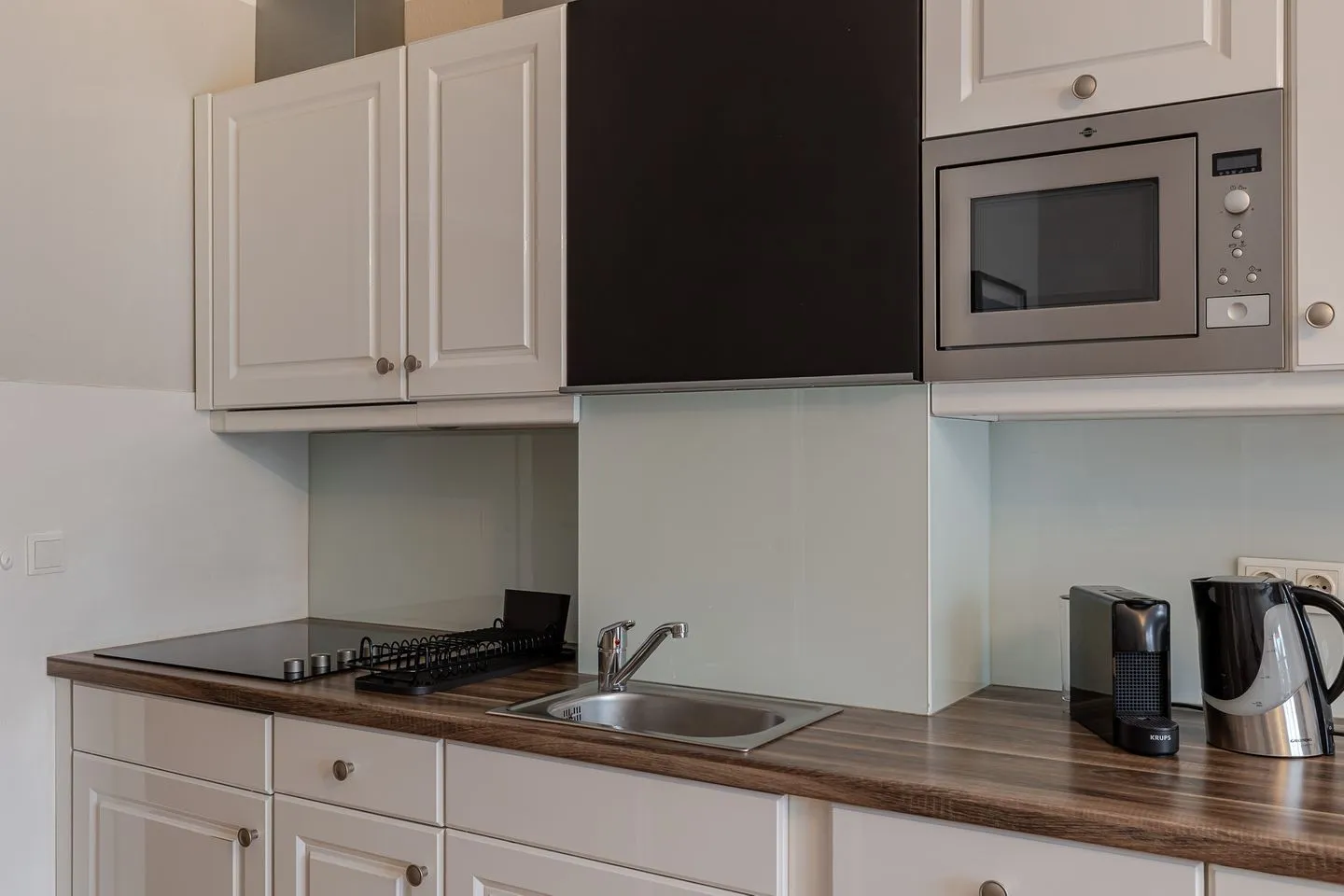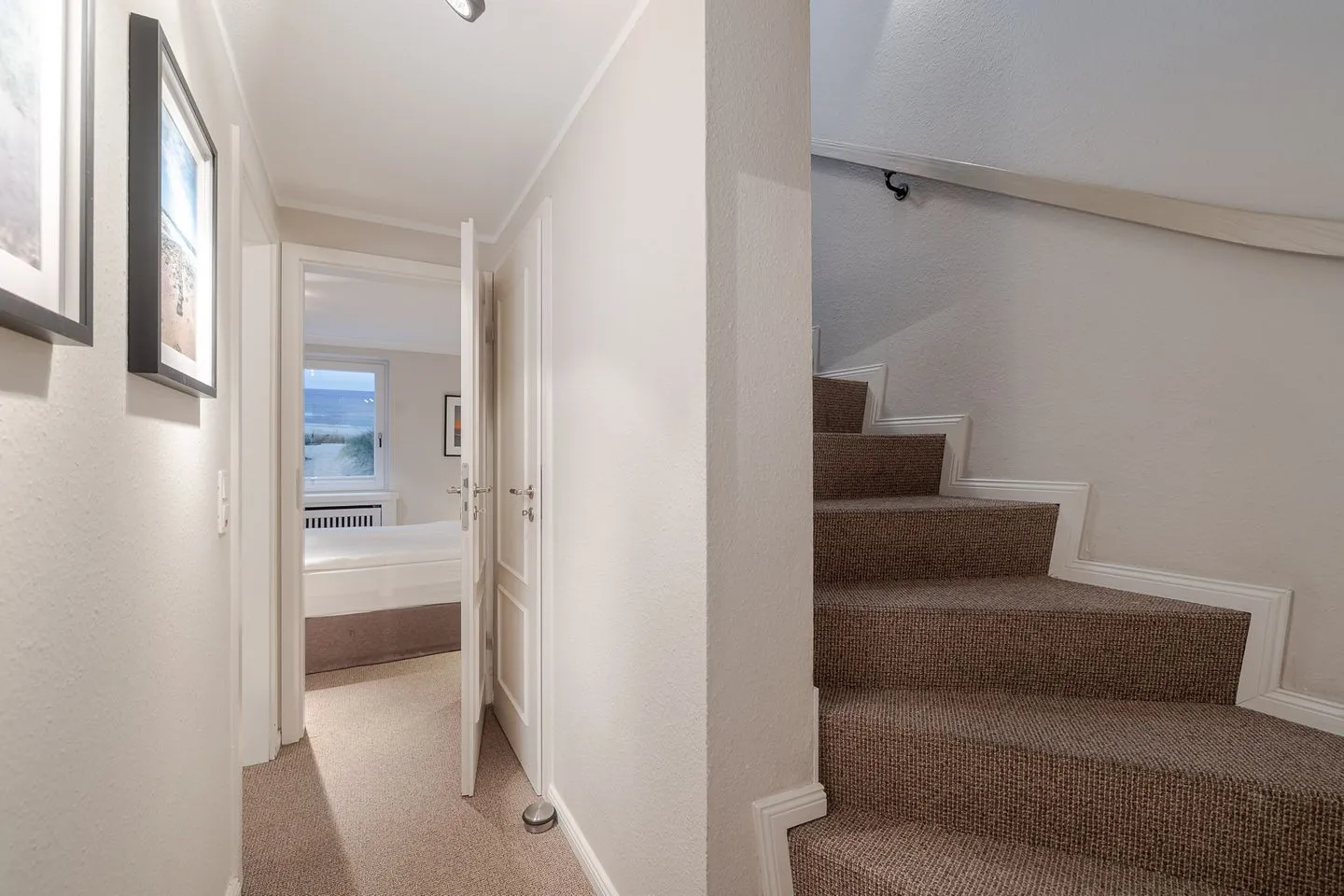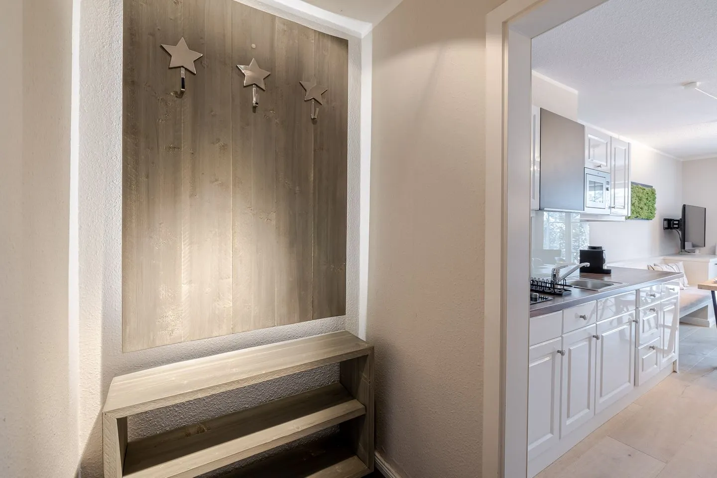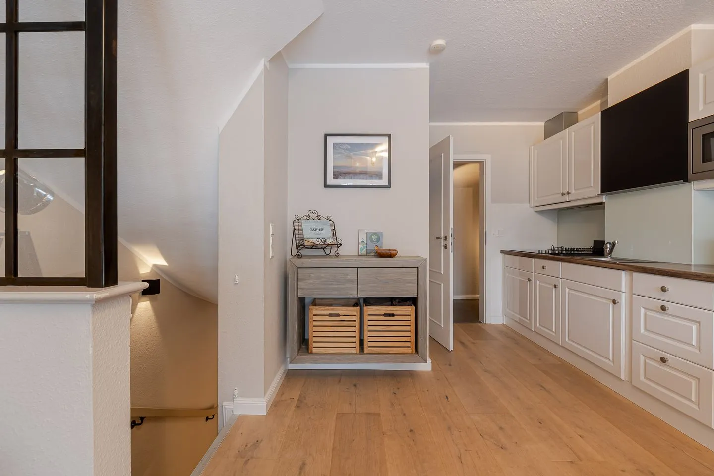Auf zwei Ebenen und rund 60 m² bietet das Küstennest Raum für bis zu vier Personen. Der Wohnbereich ist offen, lichtdurchflutet und genau der richtige Ort für gemeinsames Ankommen – morgens mit Kaffee, nach einem Strandtag oder in den ruhigeren Abendstunden. Die Küche ist vollständig ausgestattet und selbstverständlich Teil des Raumes, funktional und hochwertig, ohne den Wohncharakter zu verlieren.
