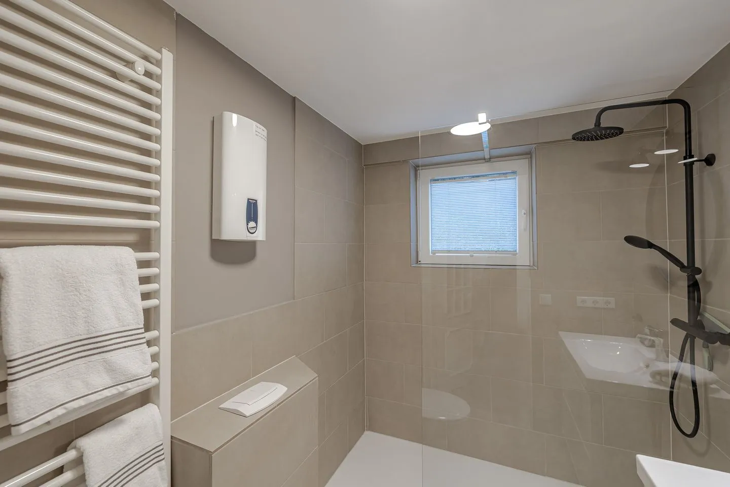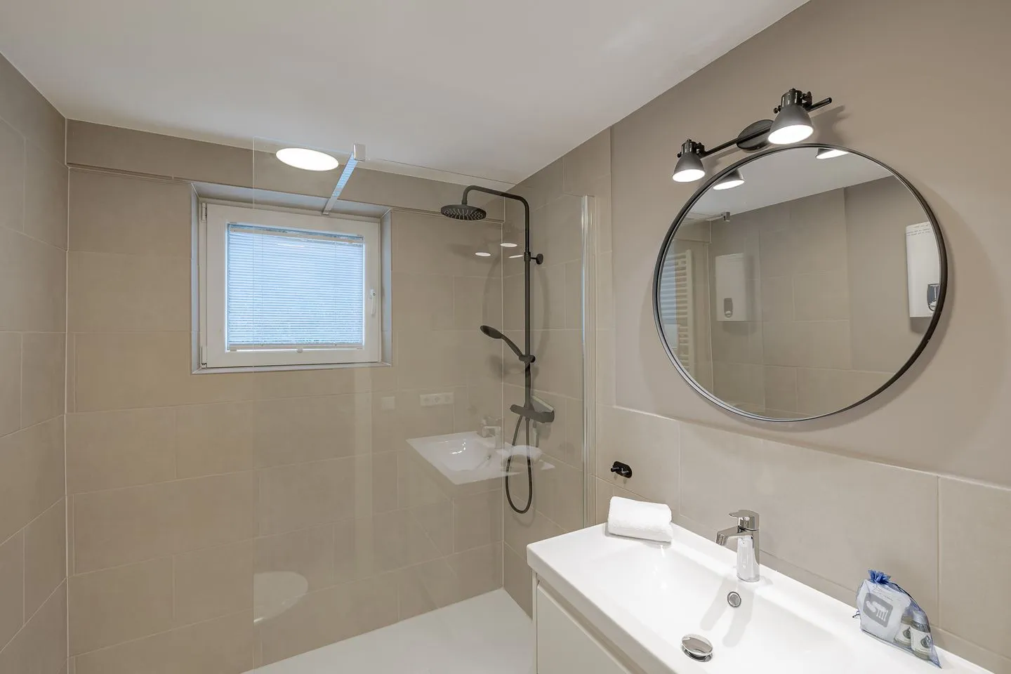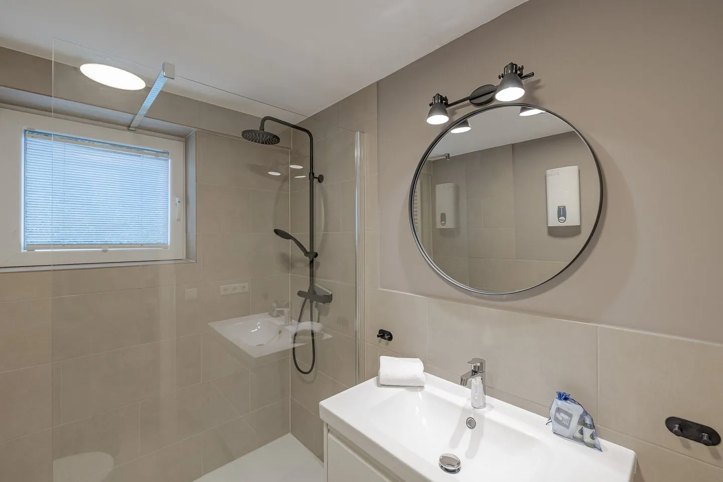 Das Badezimmer präsentiert sich modern, hochwertig und großzügig gestaltet, mit einer bodengleichen Dusche und klarer, zeitloser Gestaltung. Ein Raum, der den Aufenthalt spürbar aufwertet und nach einem Tag am Meer zum Wohlfühlen einlädt.