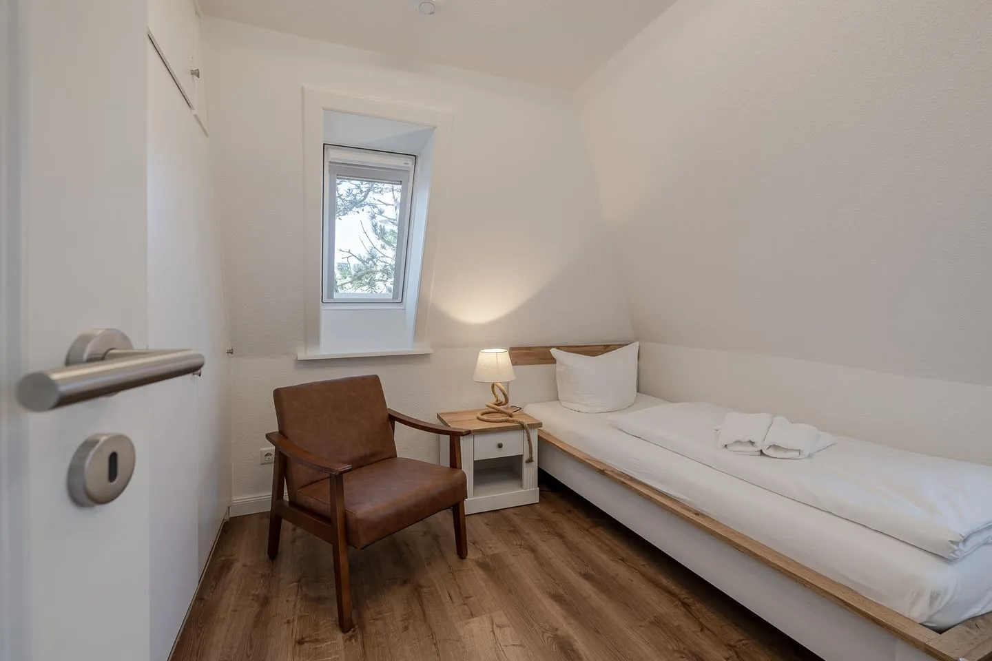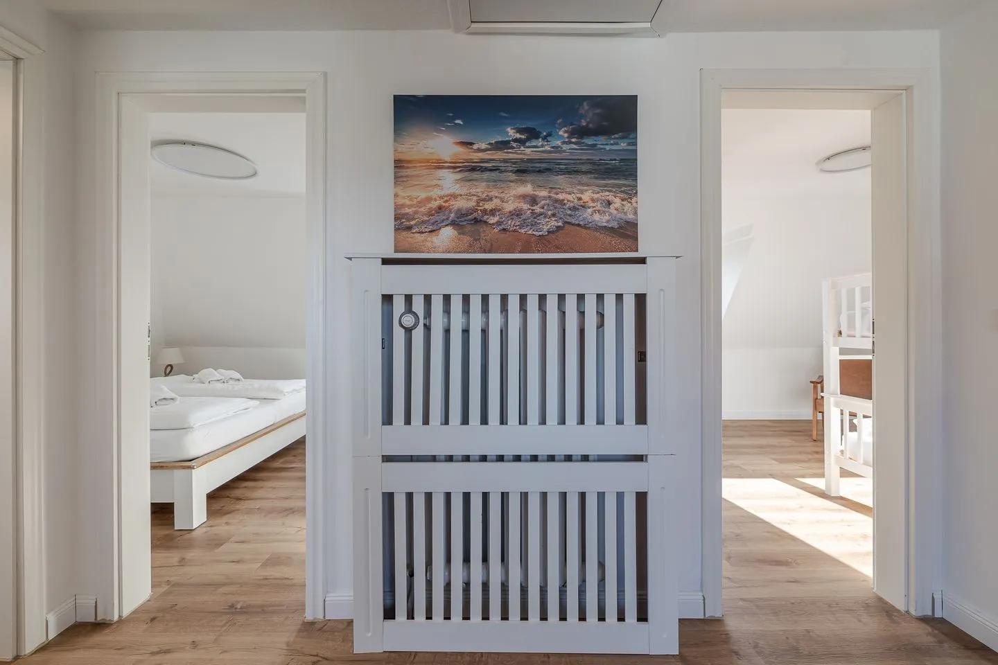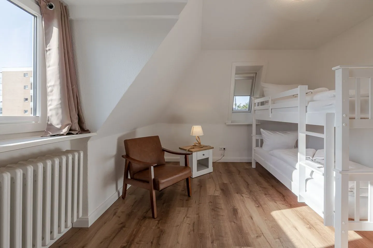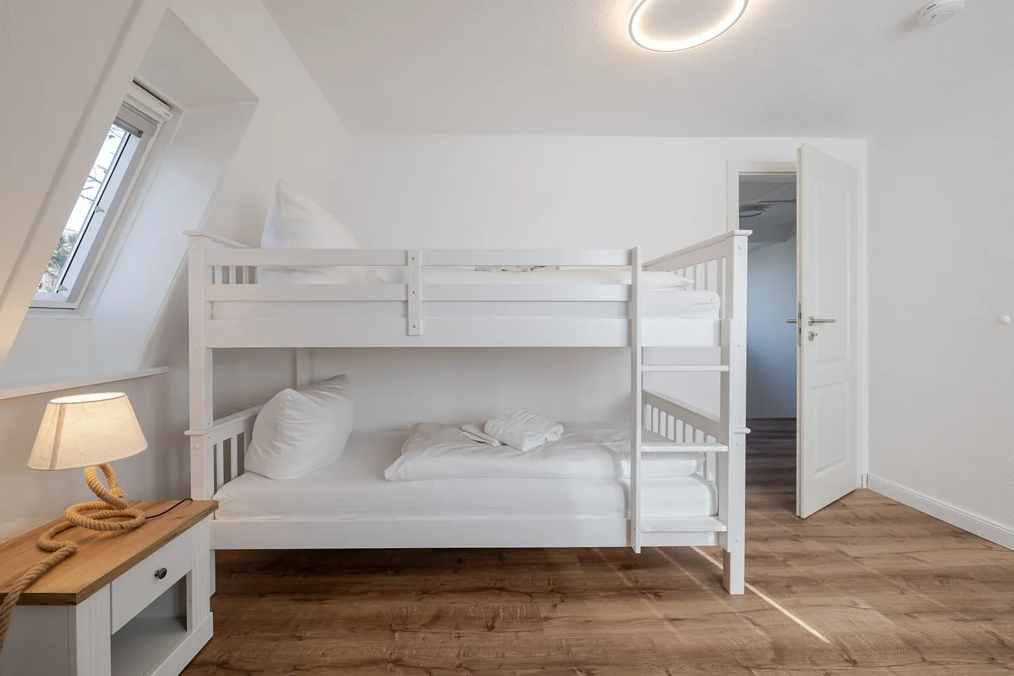 Über eine helle Treppe gelangt man ins Obergeschoss, wo sich das Gefühl von Raum und Klarheit konsequent fortsetzt. Zwei weitere Doppelzimmer – eines davon mit Stockbett – sowie ein zusätzliches Einzelzimmer bieten viel Flexibilität für Familien, Freunde oder mehrere gemeinsam reisende Parteien. Ergänzt wird dieser Bereich durch ein hochwertig gestaltetes Badezimmer sowie ein weiteres WC, das das Obergeschoss stimmig abrundet.
