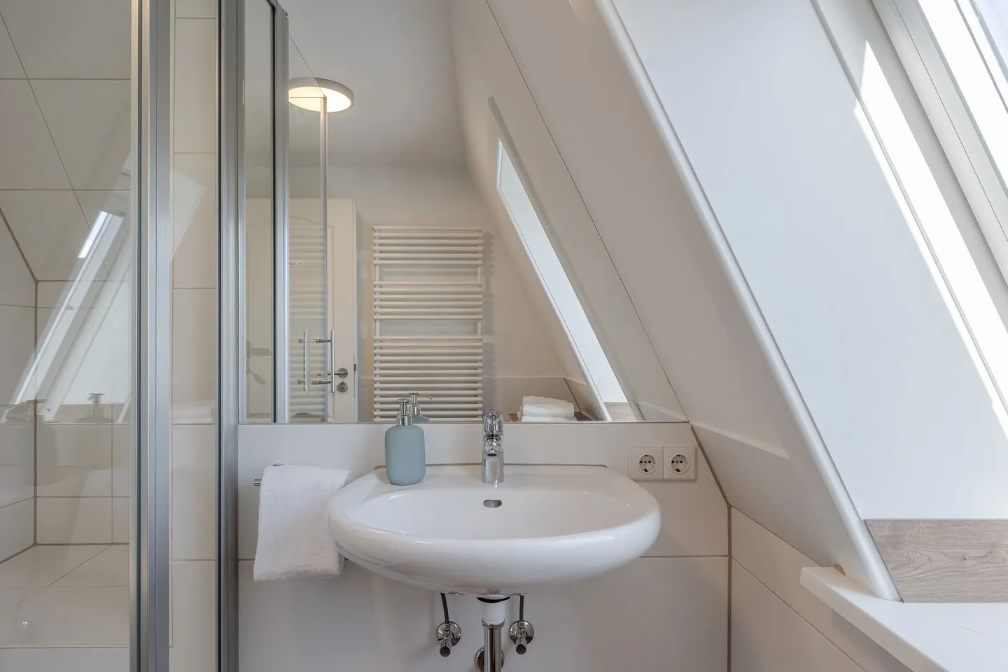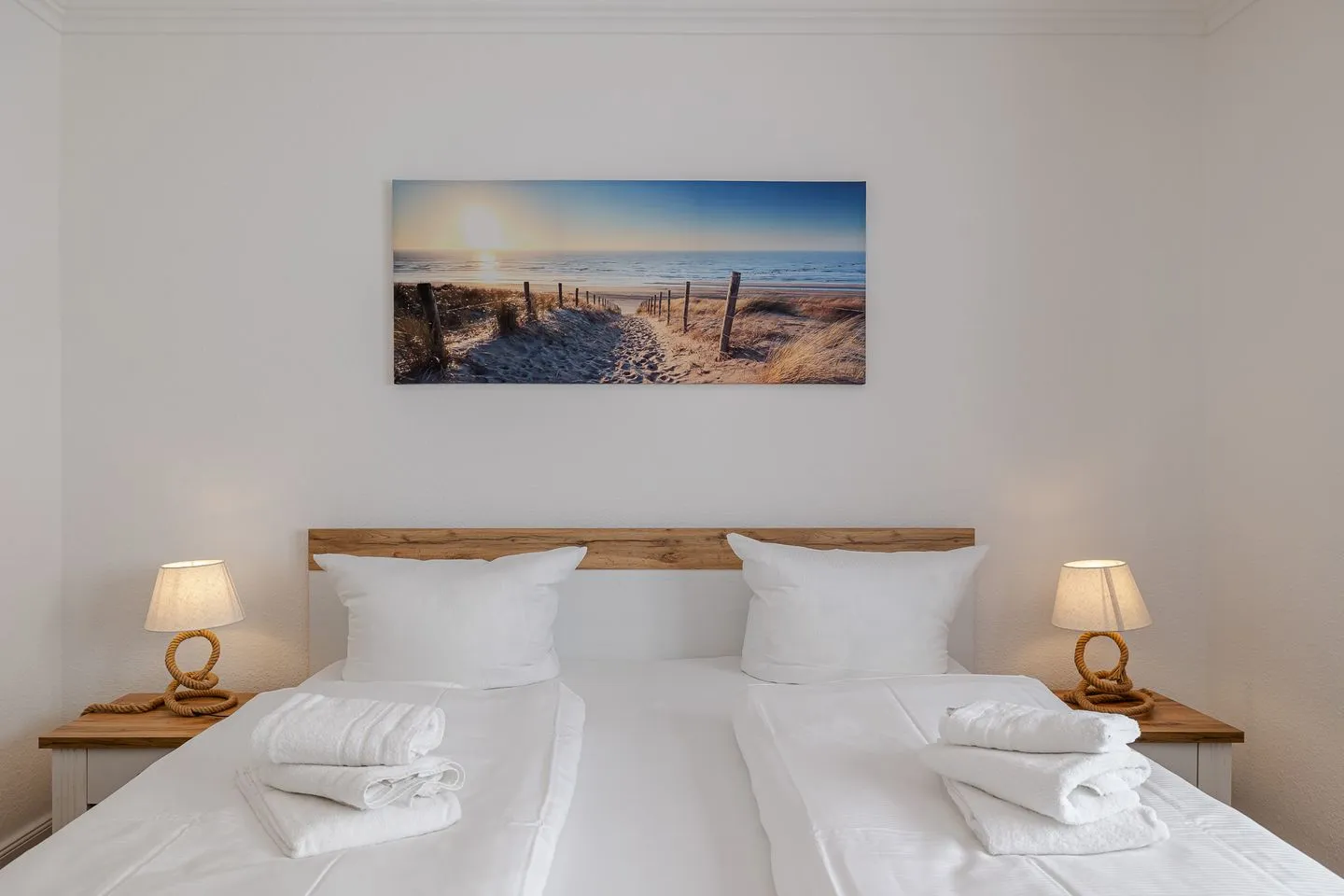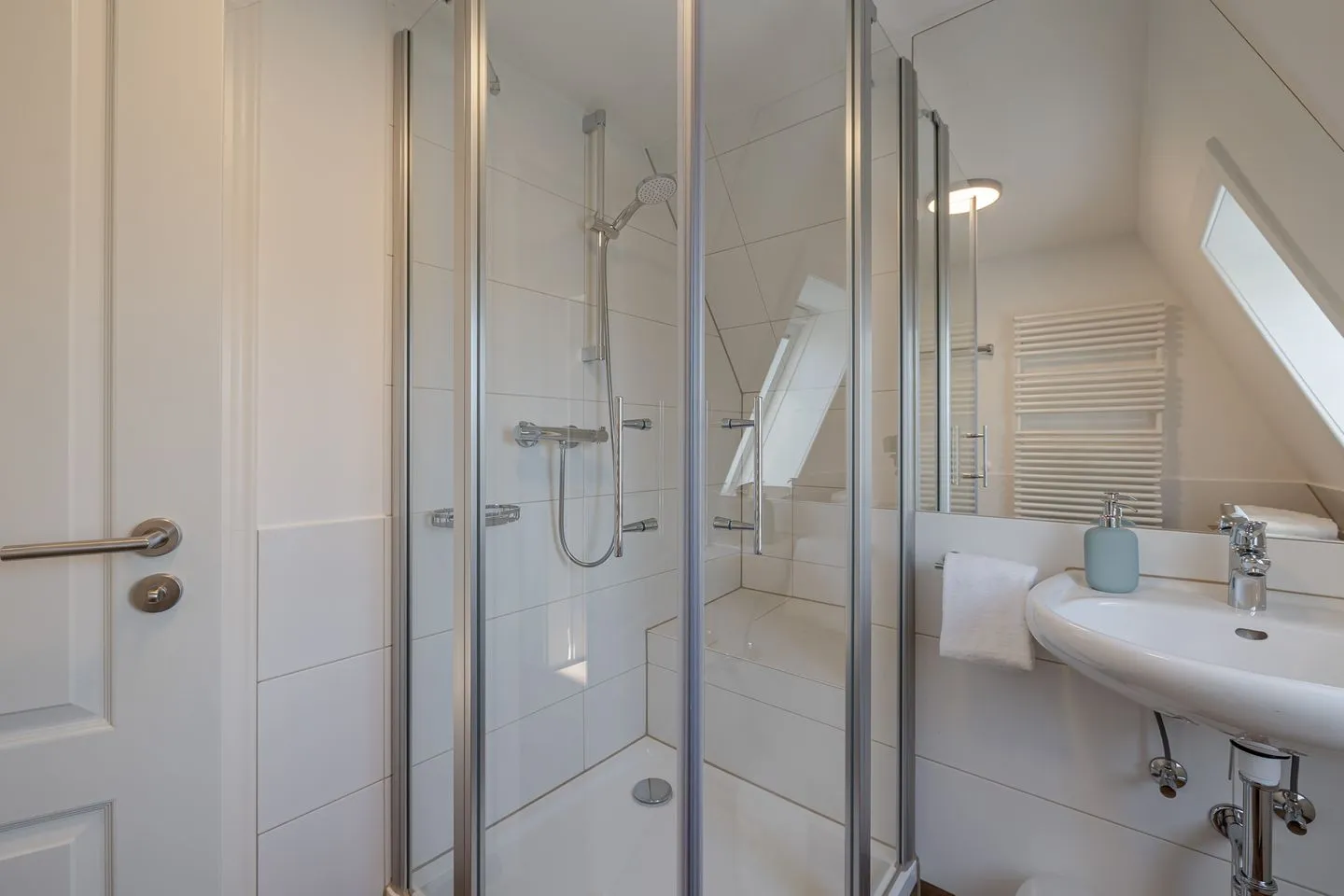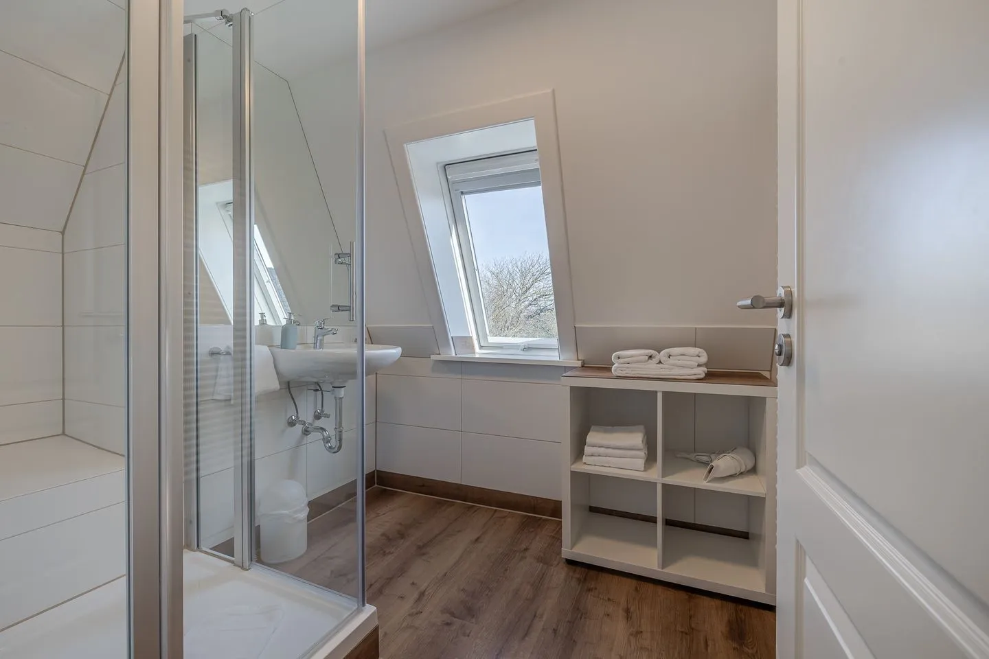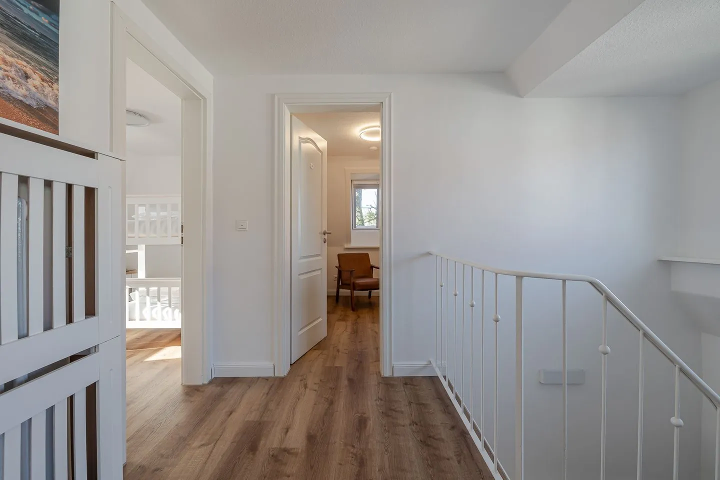 Über eine helle Treppe gelangt man ins Obergeschoss, wo sich das Gefühl von Raum und Klarheit konsequent fortsetzt. Zwei weitere Doppelzimmer – eines davon mit Stockbett – sowie ein zusätzliches Einzelzimmer bieten viel Flexibilität für Familien, Freunde oder mehrere gemeinsam reisende Parteien. Ergänzt wird dieser Bereich durch ein hochwertig gestaltetes Badezimmer sowie ein weiteres WC, das das Obergeschoss stimmig abrundet.