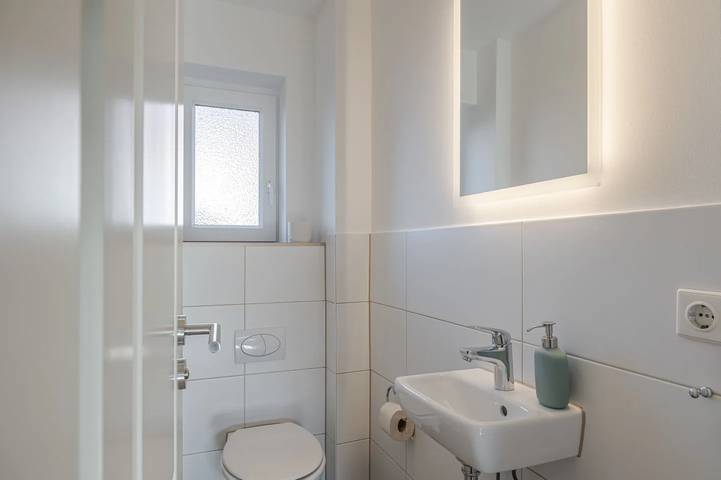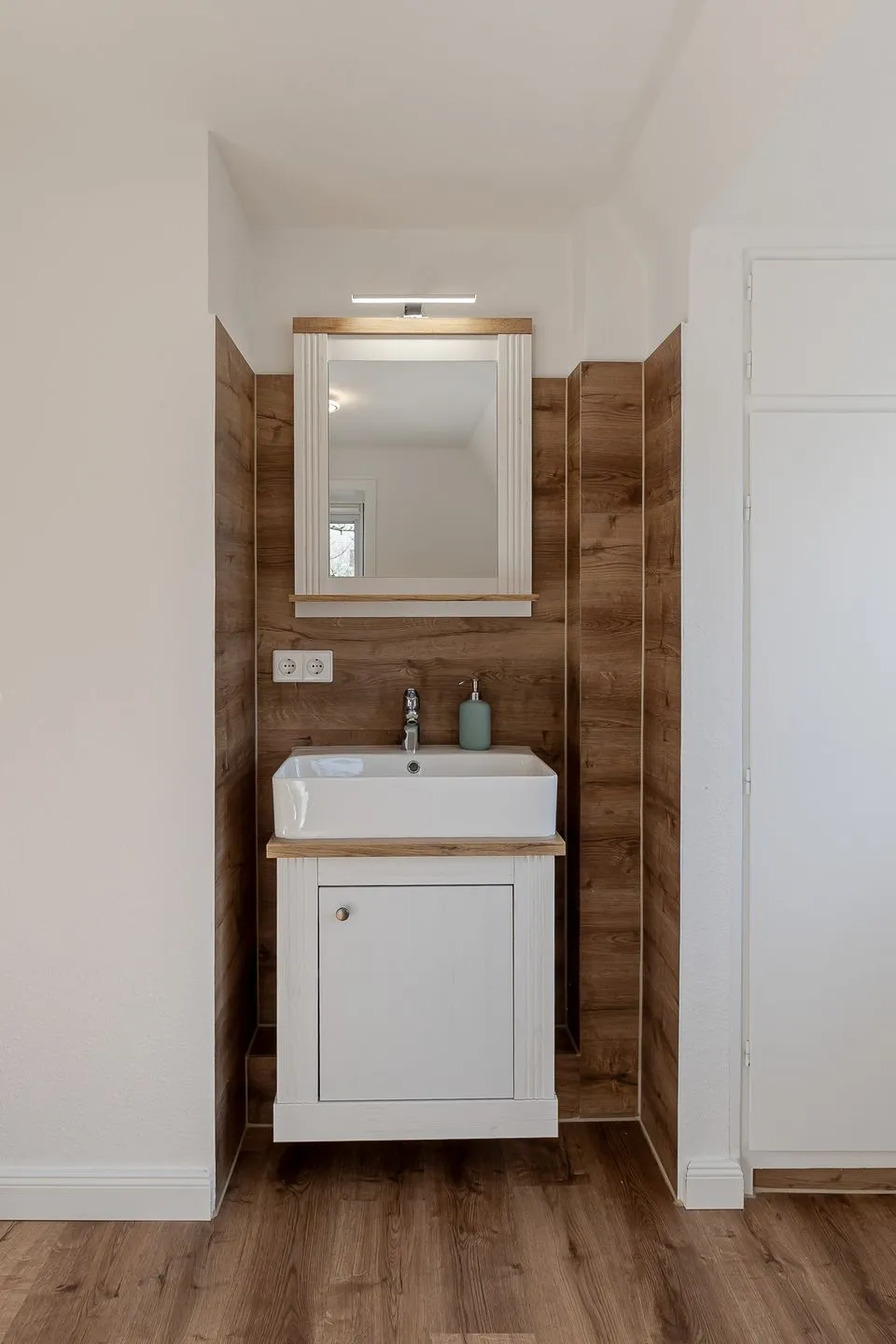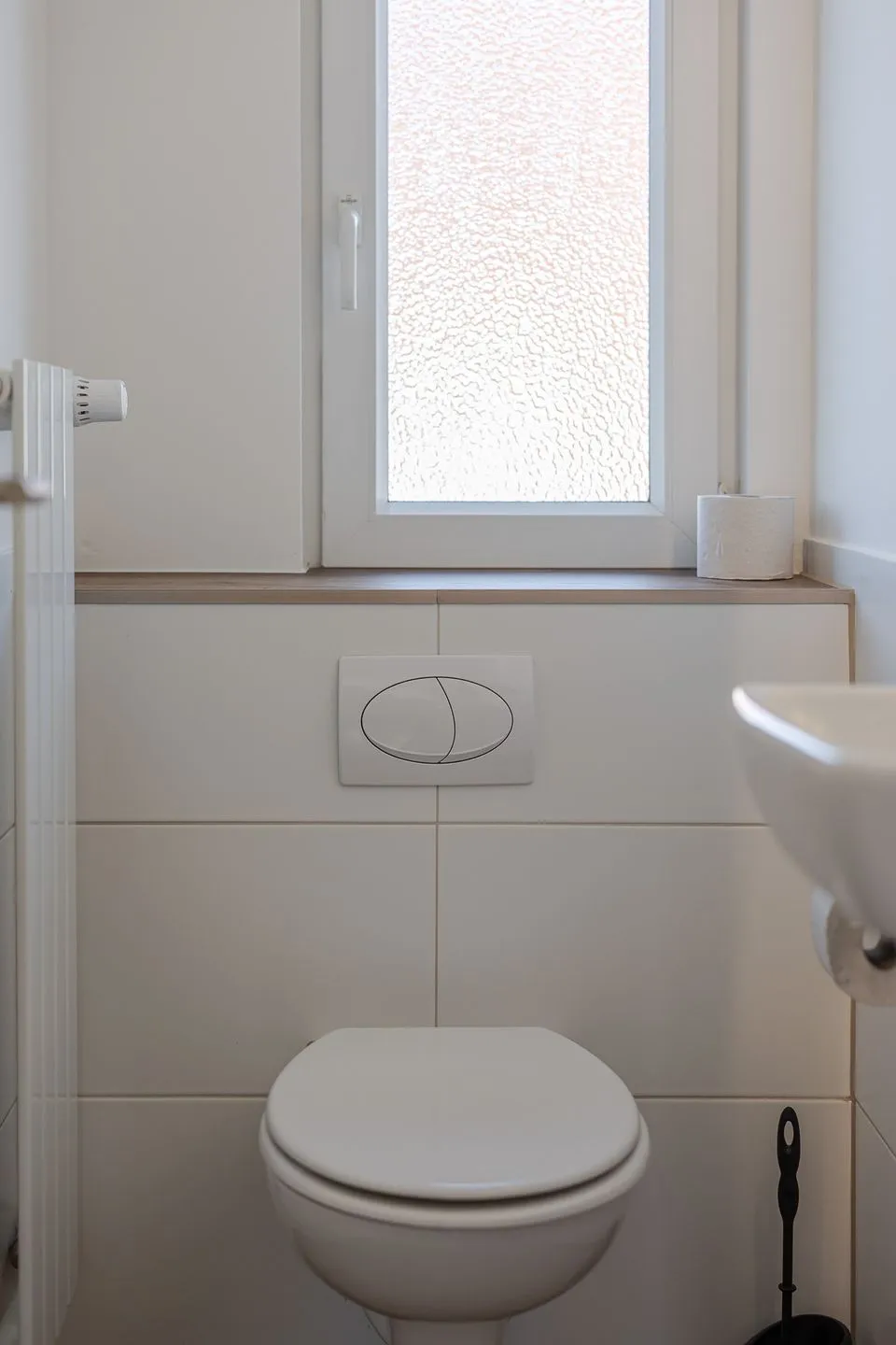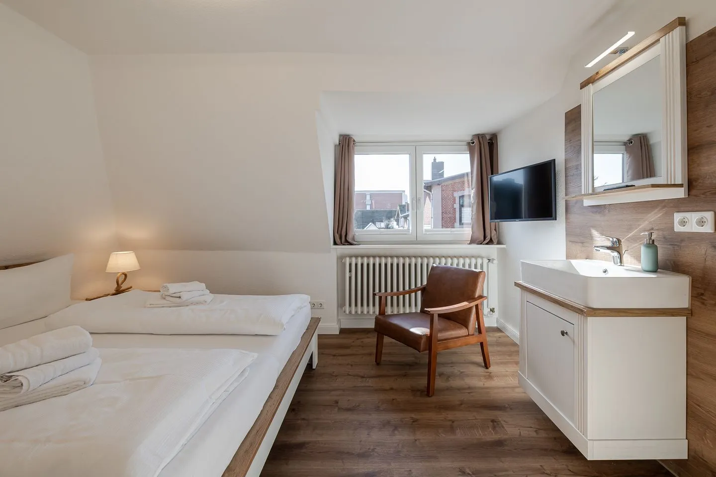 Über eine helle Treppe gelangt man ins Obergeschoss, wo sich das Gefühl von Raum und Klarheit konsequent fortsetzt. Zwei weitere Doppelzimmer – eines davon mit Stockbett – sowie ein zusätzliches Einzelzimmer bieten viel Flexibilität für Familien, Freunde oder mehrere gemeinsam reisende Parteien. Ergänzt wird dieser Bereich durch ein hochwertig gestaltetes Badezimmer sowie ein weiteres WC, das das Obergeschoss stimmig abrundet.