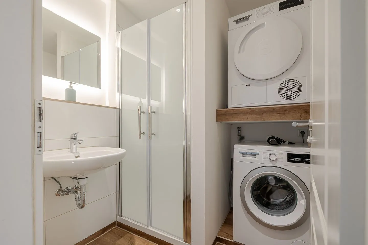 Im Erdgeschoss befinden sich neben zwei Schlafzimmern eine großzügige, voll ausgestattete Küche, ein modernes Badezimmer sowie eine separate Dusche und ein zusätzliches WC. Alles ist durchdacht angeordnet, funktional und zugleich offen gestaltet. Besonders angenehm: Sämtliche Räume und Bäder verfügen über Tageslicht und verleihen dem gesamten Haus eine natürliche Leichtigkeit.