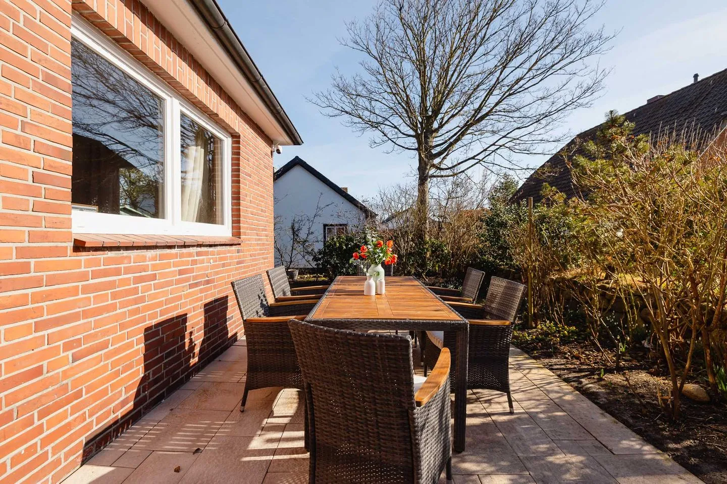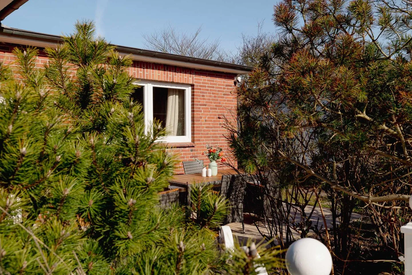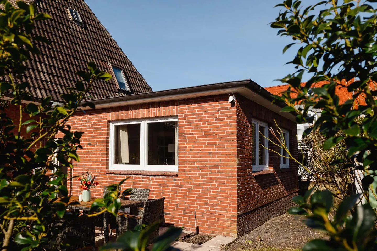 Auch im Außenbereich zeigt sich der Ankerplatz vielseitig. Zur Straße hin öffnet sich ein Garten, während sich hinter dem Haus ein ruhiger, geschützter Garten mit Terrasse befindet – ideal für gemeinsame Mahlzeiten, entspannte Stunden oder spielende Kinder. Ein separater Schuppen bietet künftig Platz für Fahrräder und E-Bikes und macht das Haus besonders praktisch für längere Aufenthalte und aktive Urlaubstage.