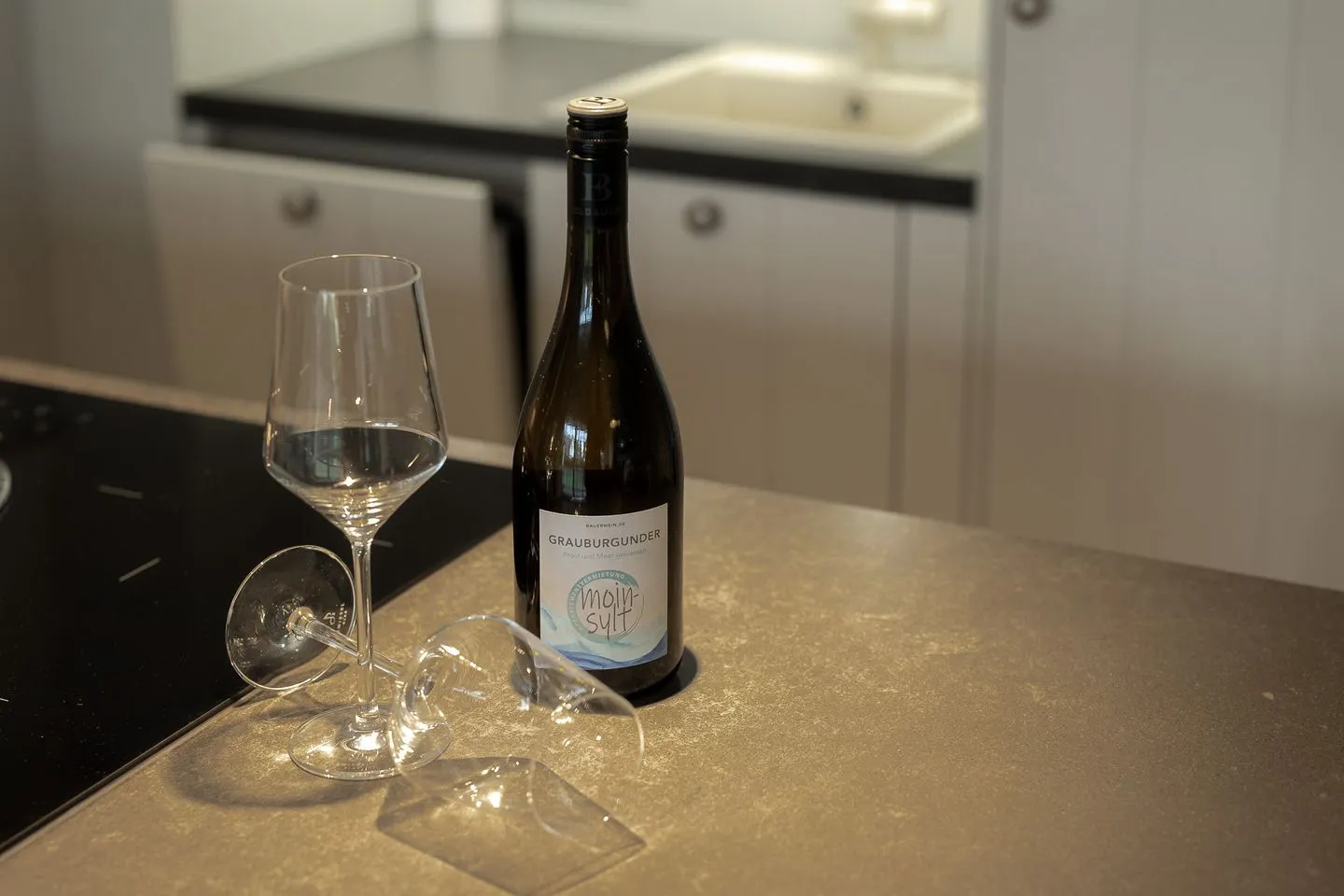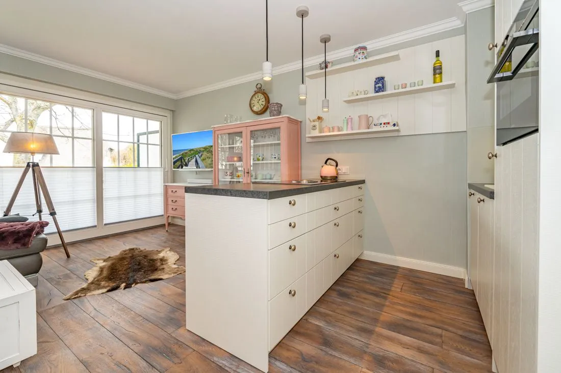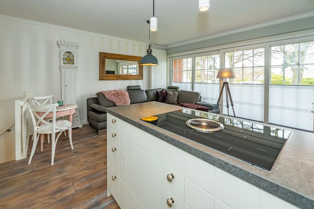 Auf rund 58 m² bietet das liebevoll gestaltete Ferienhaus Platz für bis zu drei Gäste. Die Räume sind durchdacht geschnitten und hochwertig eingerichtet, ohne aufdringlich zu wirken. Im Mittelpunkt steht der helle Wohn- und Essbereich mit offener, voll ausgestatteter Küche – ein Ort für gemeinsame Mahlzeiten, entspannte Abende und ruhige Urlaubsmomente. Große Fenster und klare Linien sorgen für eine angenehme, luftige Atmosphäre.
