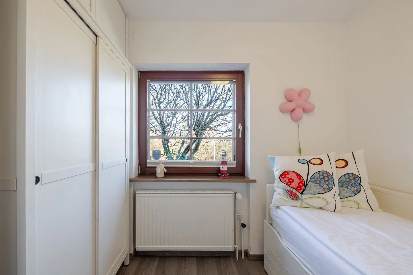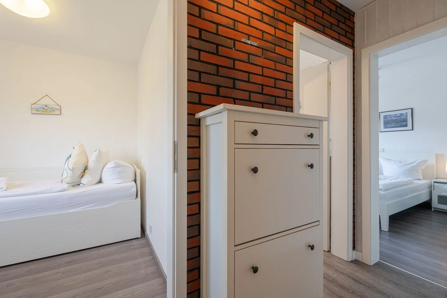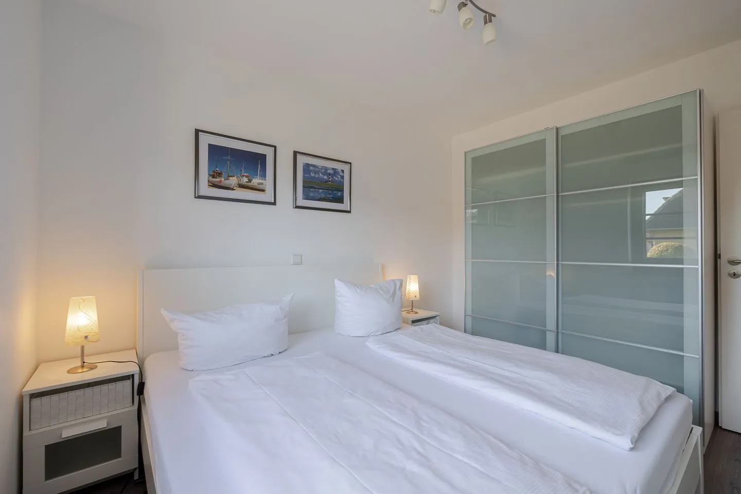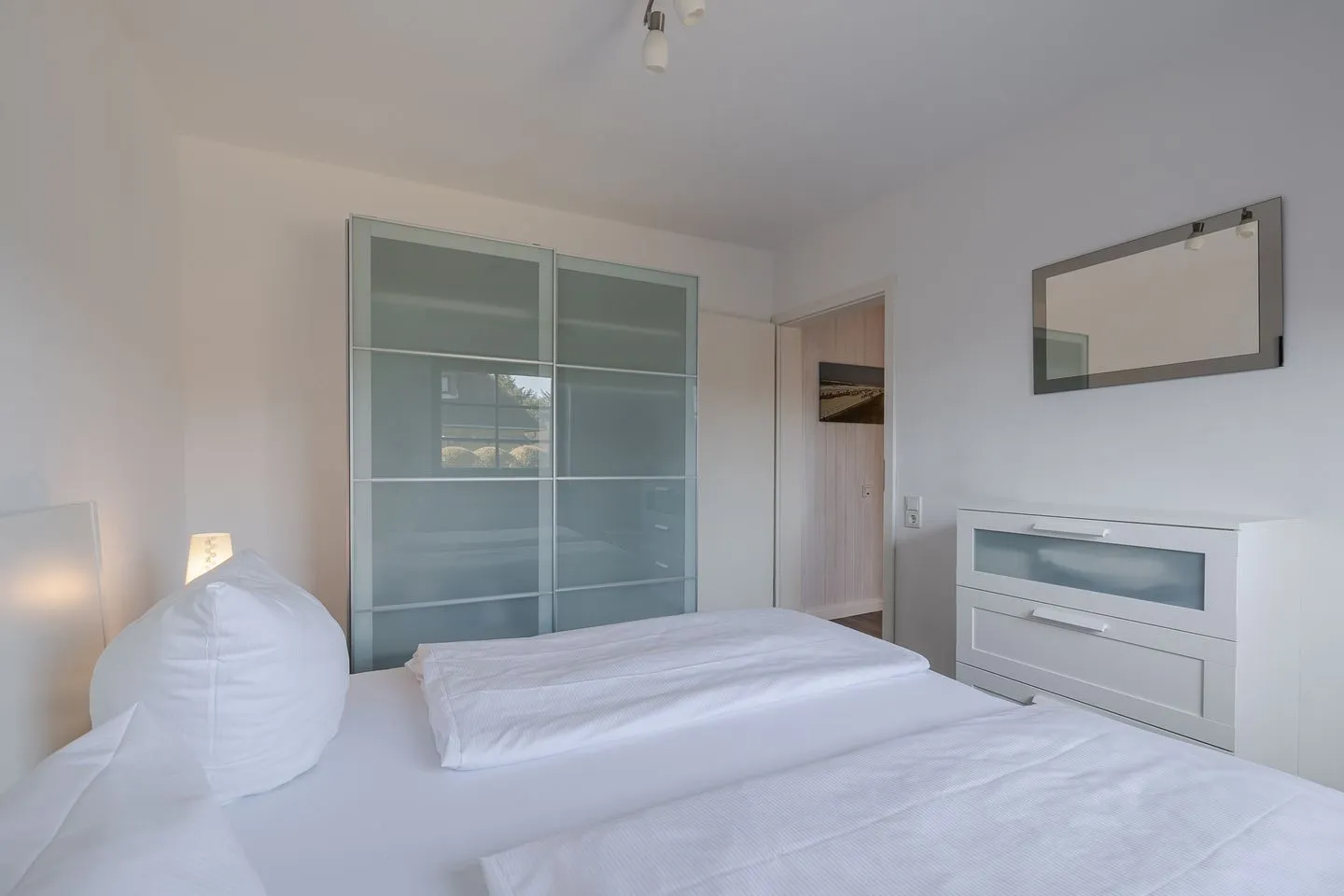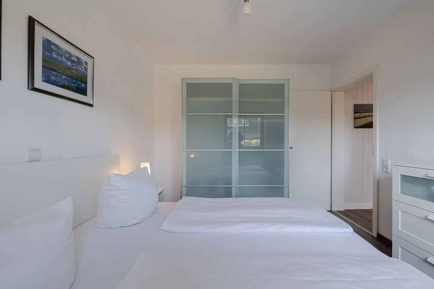 Ein Schlafzimmer ist klassisch mit einem Doppelbett ausgestattet. Das zweite Schlafzimmer verfügt über ein Einzelbett, das sich bei Bedarf zu einem Doppelbett (ca. 160 cm Breite) ausziehen lässt – eine flexible und praktische Lösung, durch die das Appartement problemlos von drei bis vier Personen genutzt werden kann.