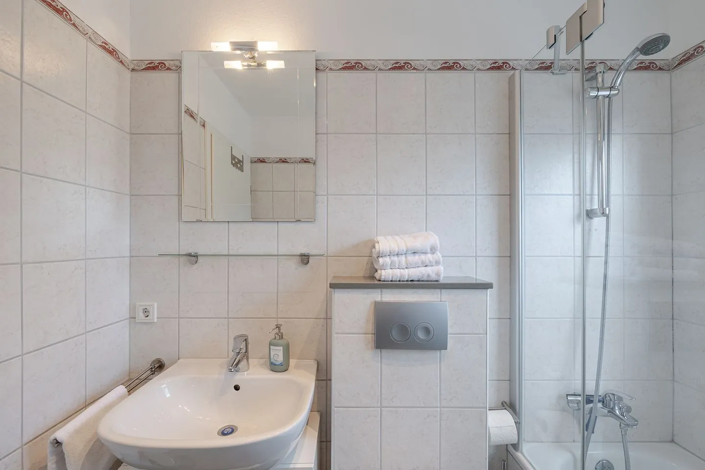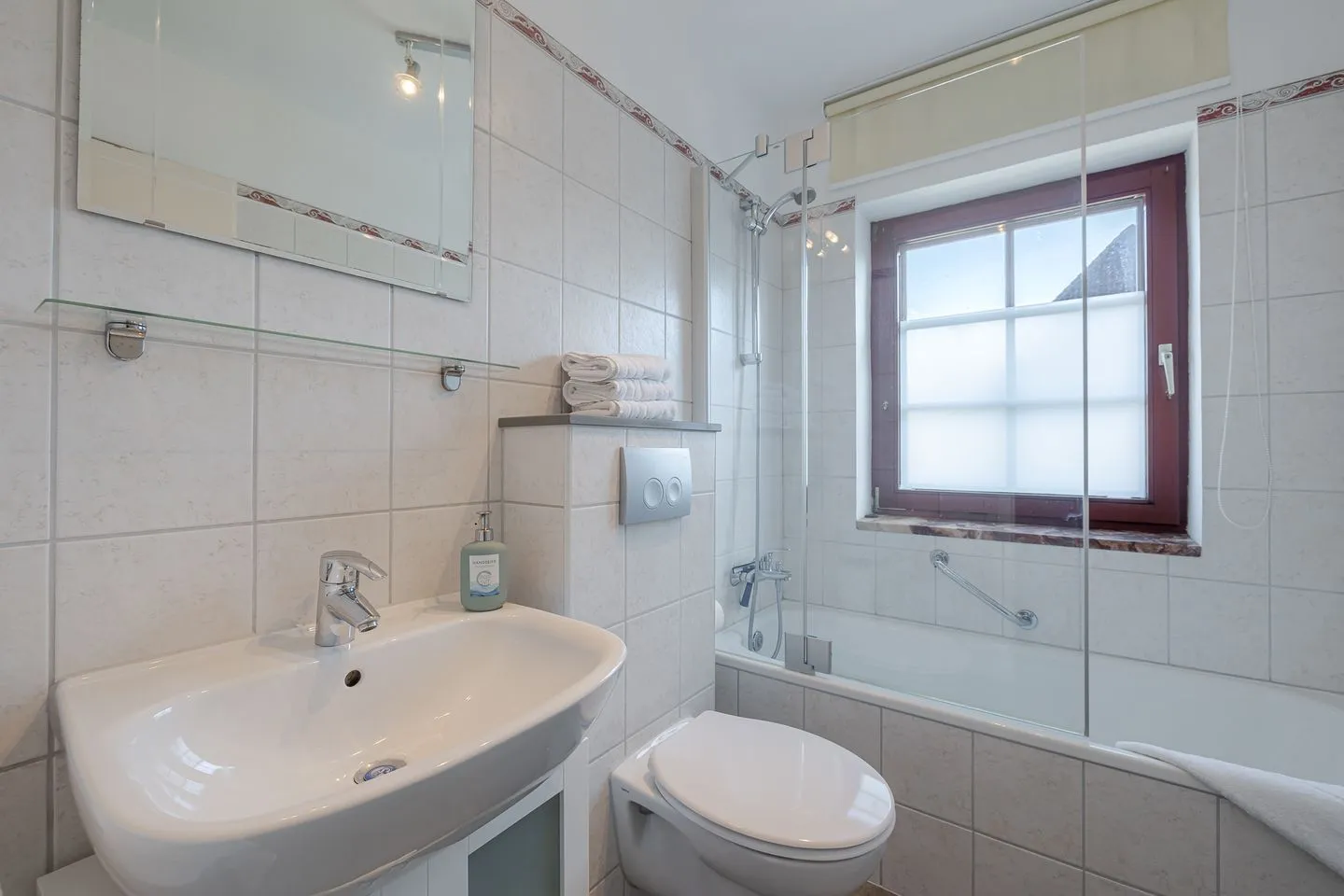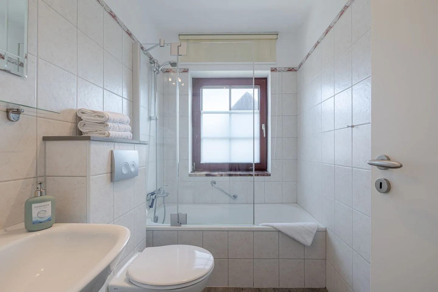 Das Badezimmer bietet Tageslicht und ist mit einer Badewanne inklusive Duschmöglichkeit ausgestattet – praktisch und angenehm zugleich.