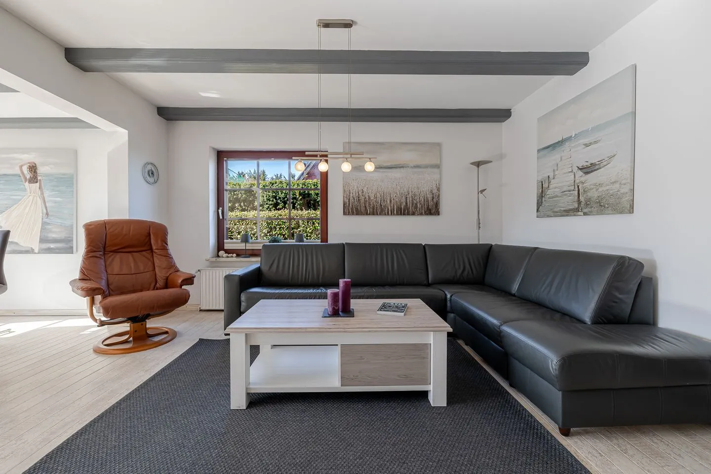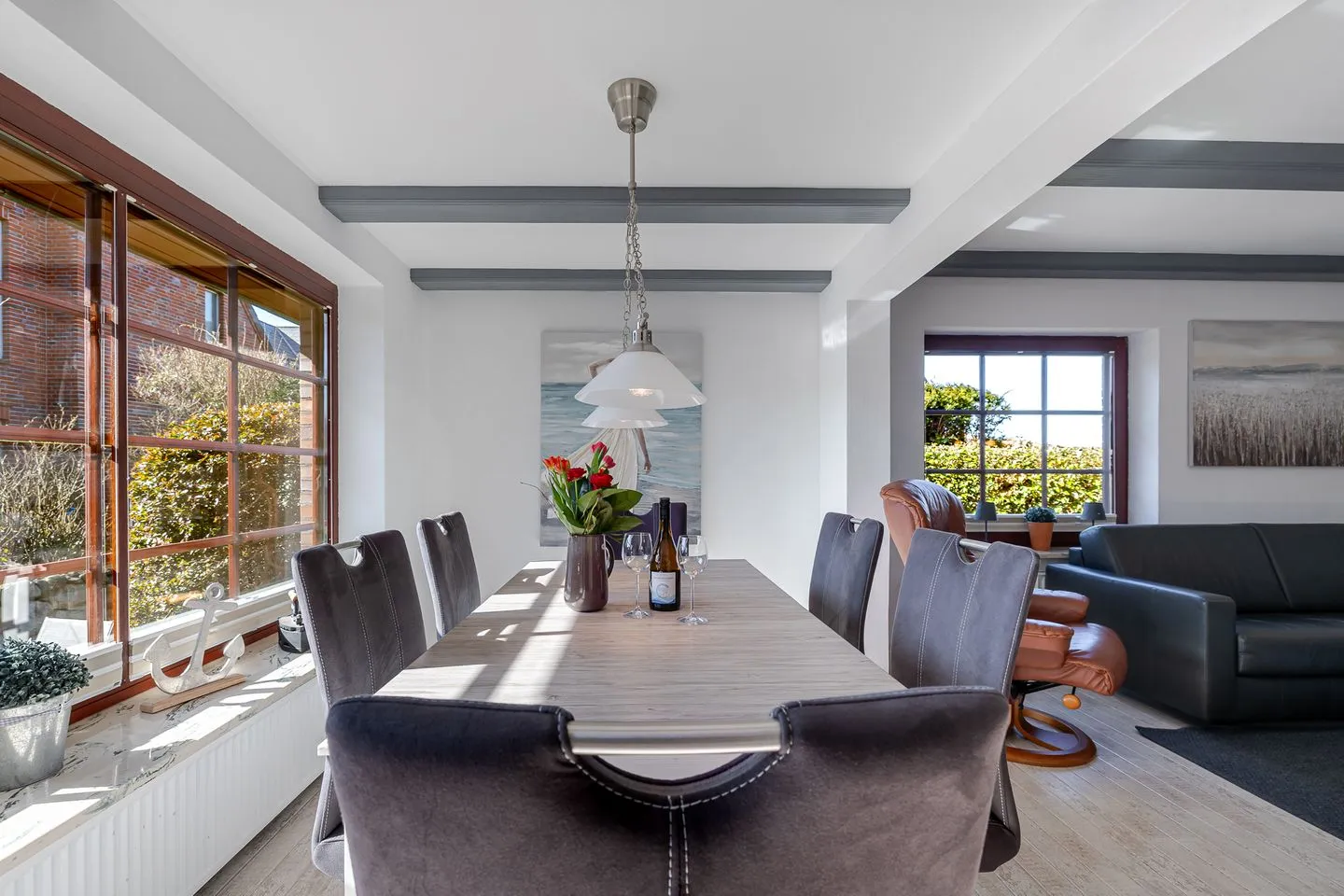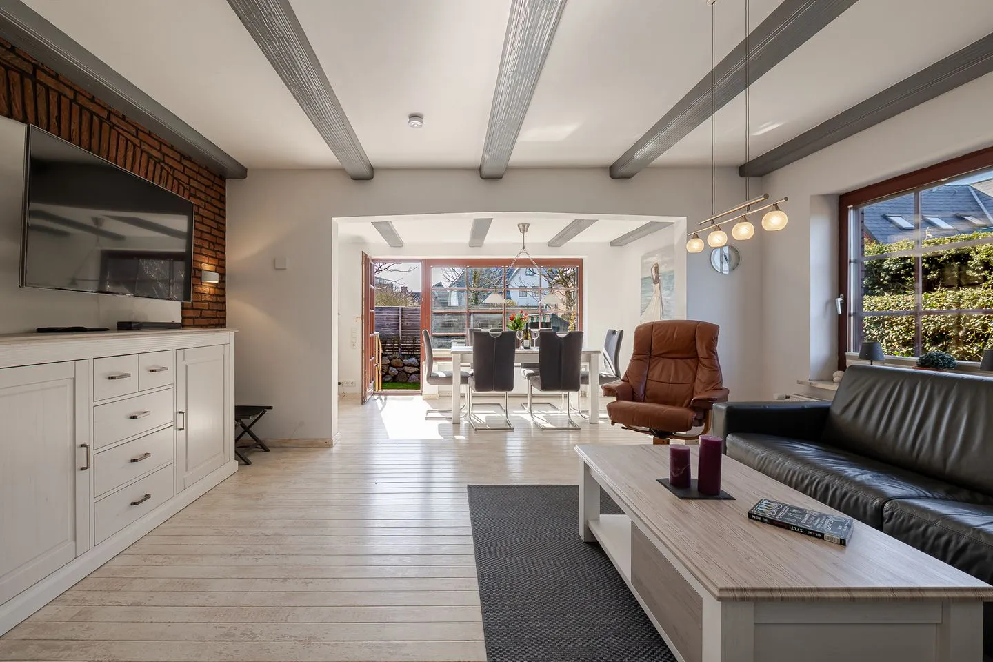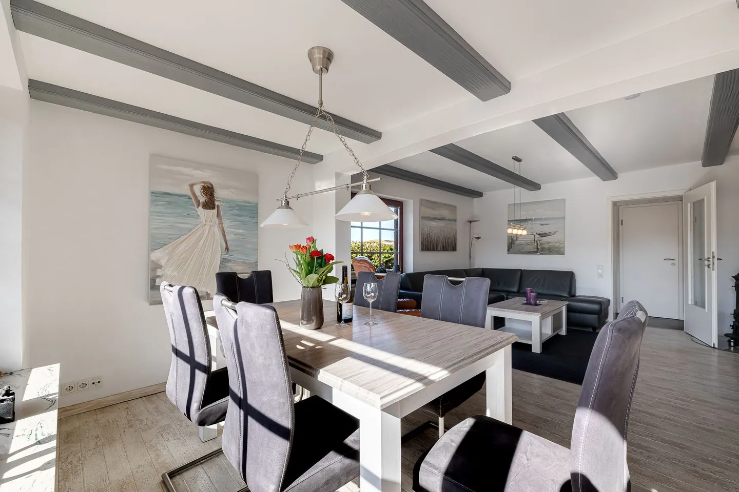 Der Wohnbereich überzeugt mit einer großen, einladenden Sofaecke sowie einem großzügigen Essplatz – perfekt für gemeinsame Abende, lange Frühstücke oder einfach entspannte Stunden nach einem Tag am Strand.