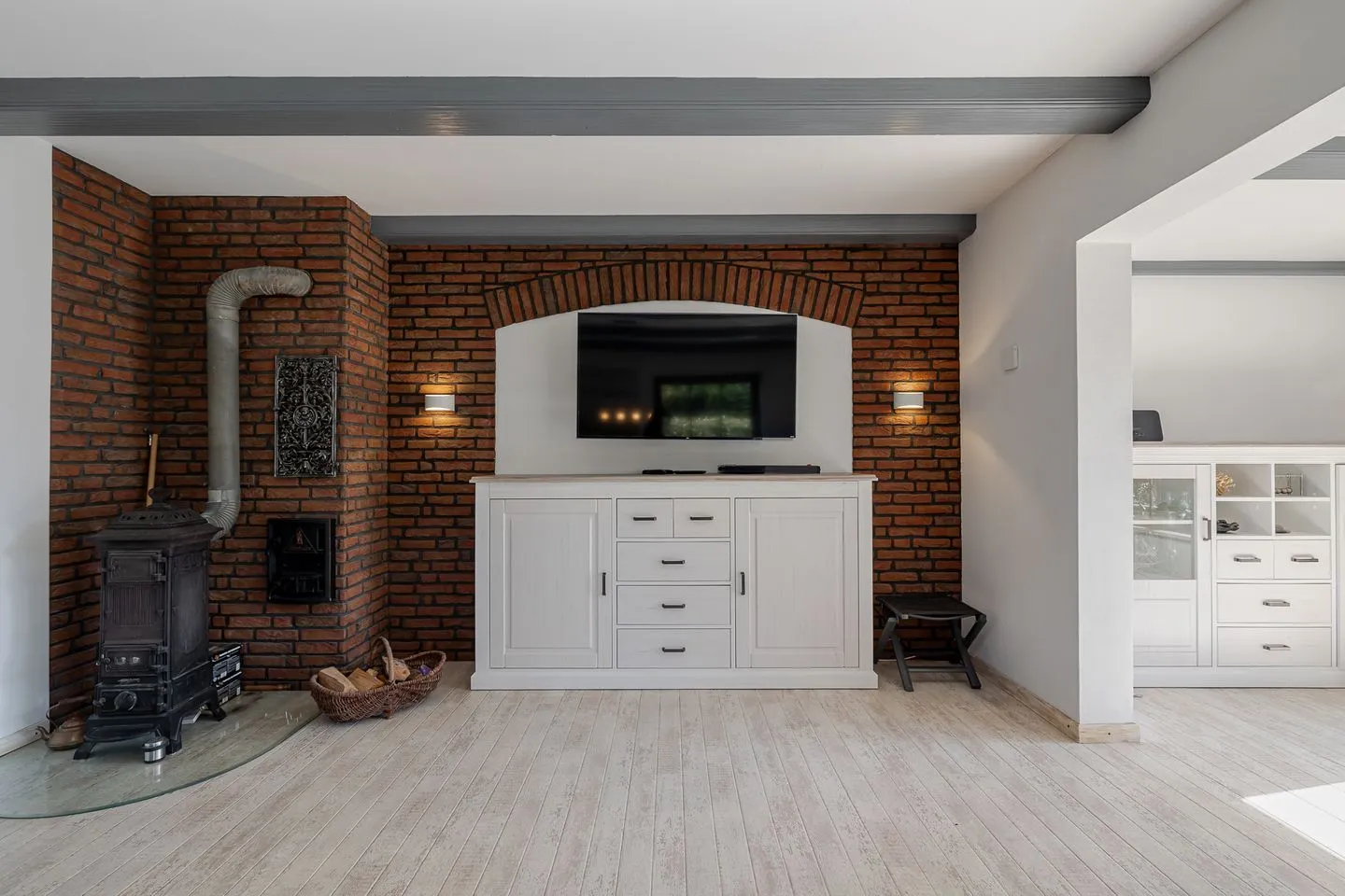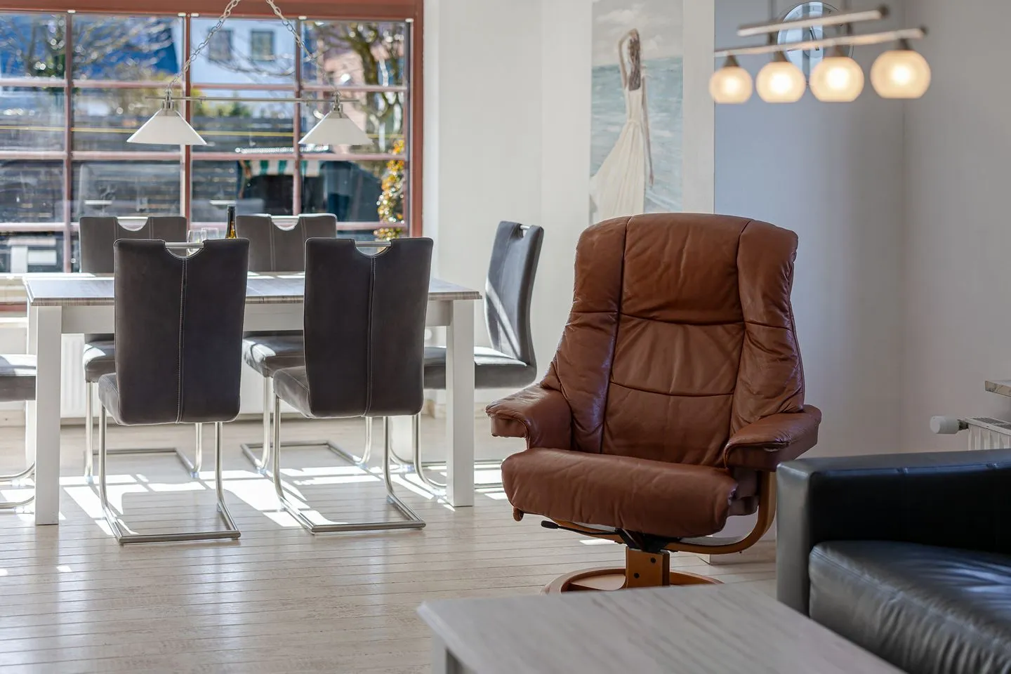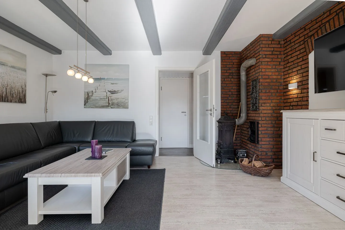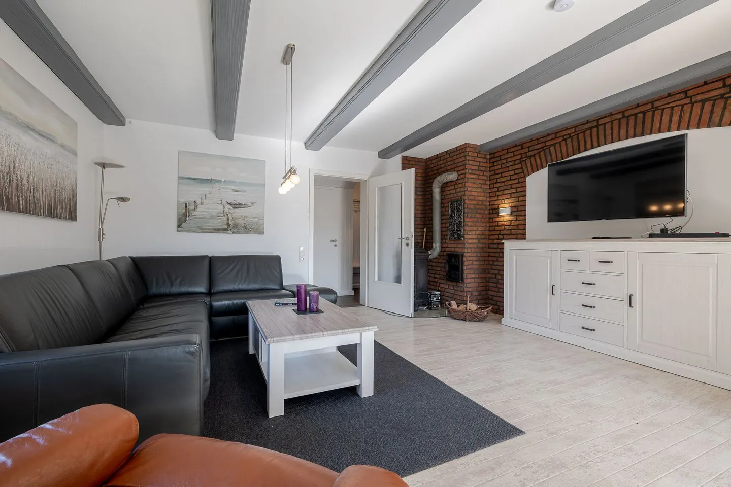 Der Wohnbereich überzeugt mit einer großen, einladenden Sofaecke sowie einem großzügigen Essplatz – perfekt für gemeinsame Abende, lange Frühstücke oder einfach entspannte Stunden nach einem Tag am Strand.