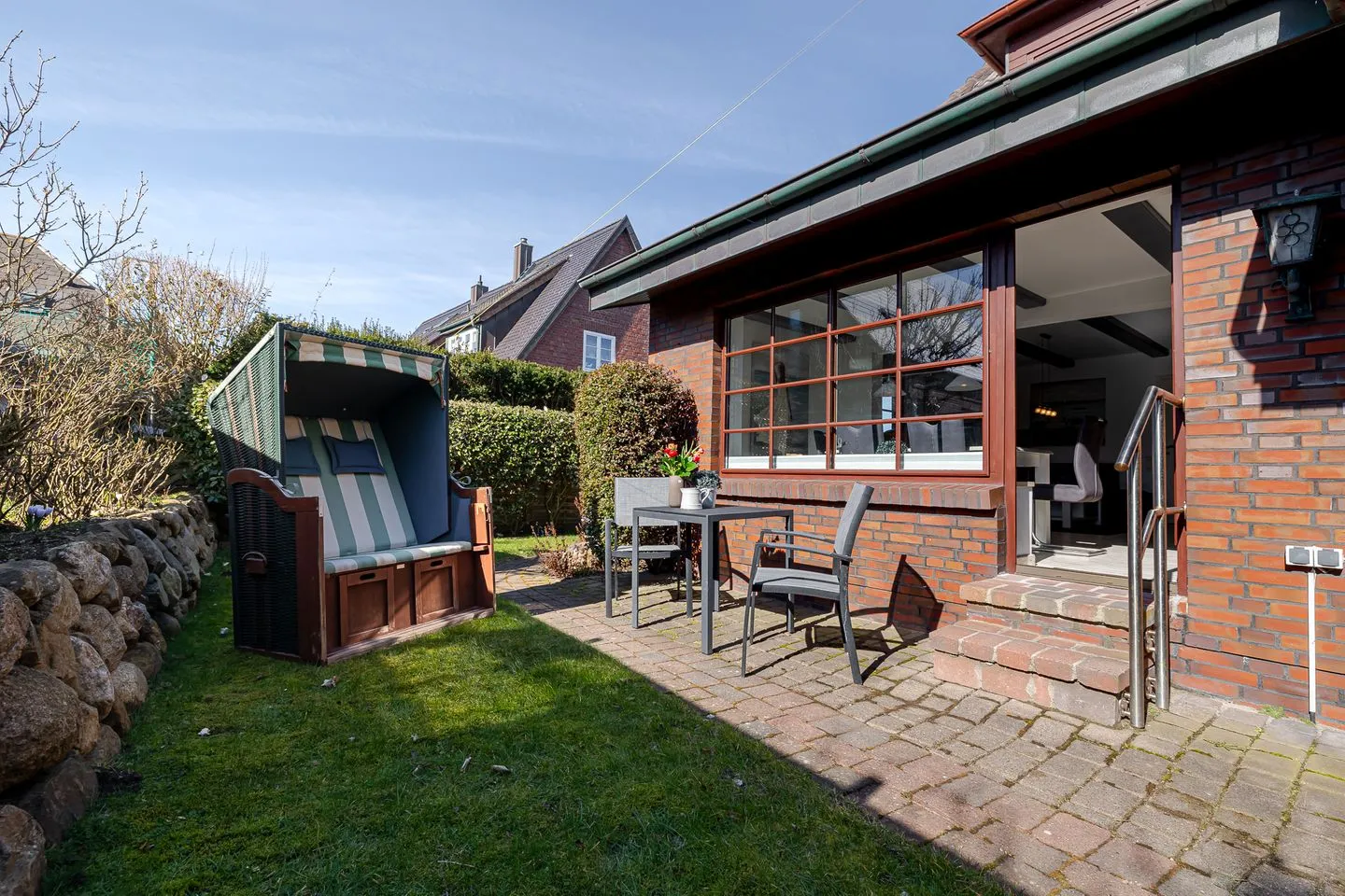 Im Außenbereich lädt die Terrasse mit Gartenmöbeln und Strandkorb dazu ein, die frische Nordseeluft zu genießen und den Tag entspannt ausklingen zu lassen.