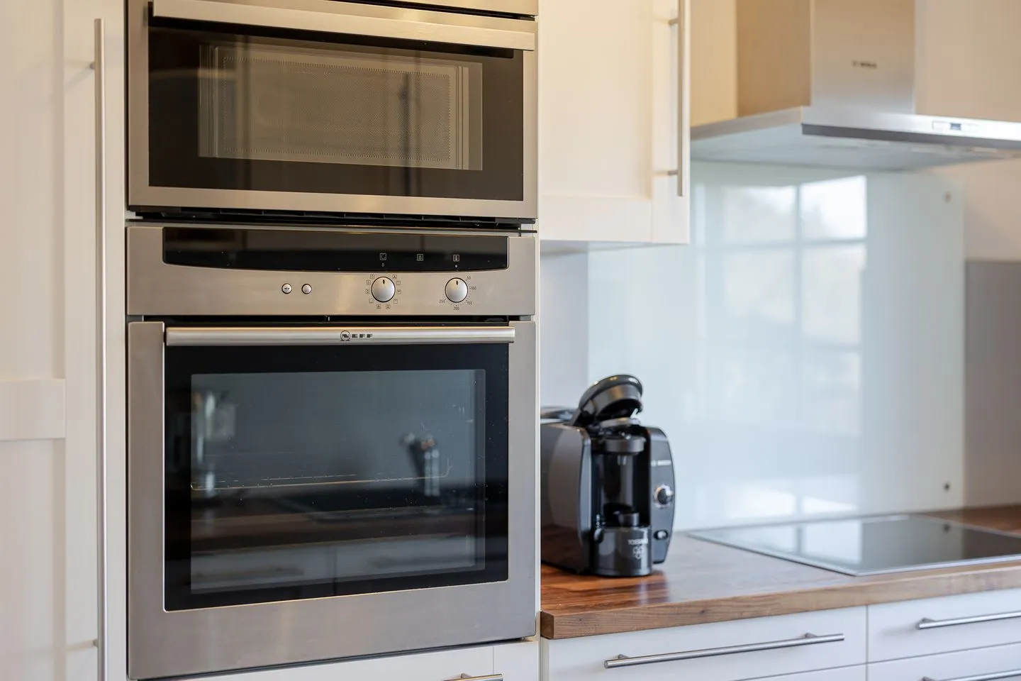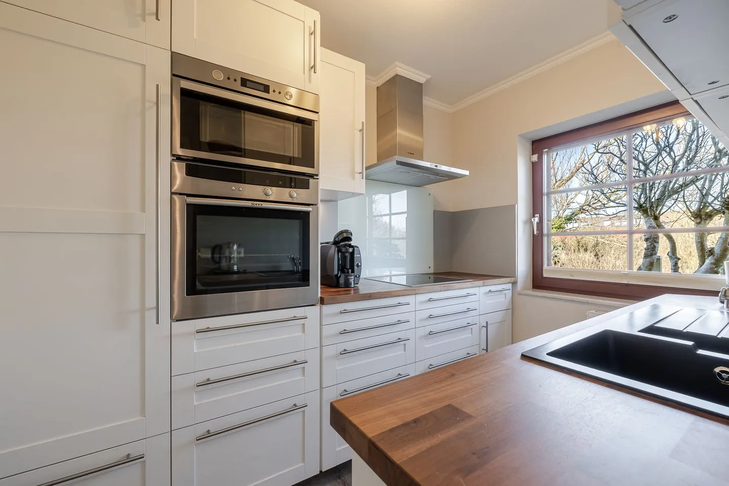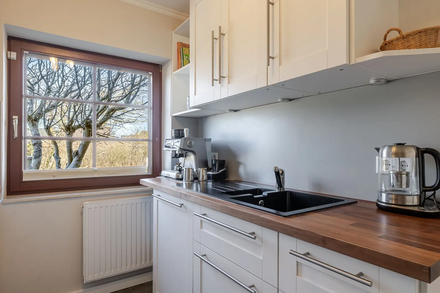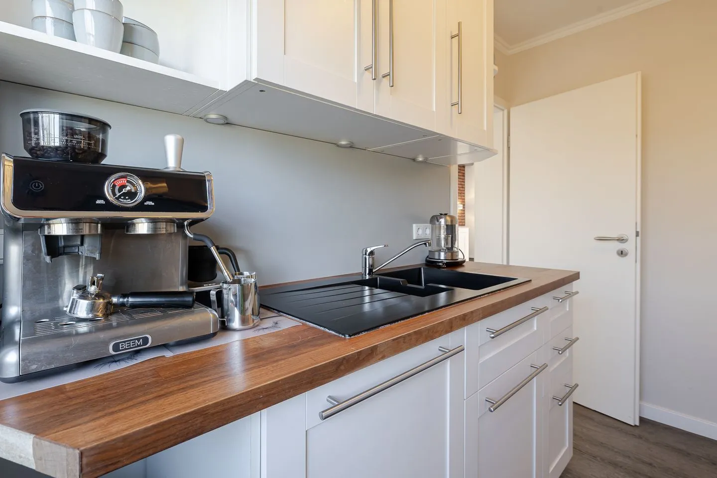 Sie ist großzügig geschnitten, verfügt über ein Fenster und ist sehr gut ausgestattet – mit Backofen, Mikrowelle, Spülmaschine und allem, was man für die Selbstversorgung braucht. Auch Kaffeeliebhaber kommen auf ihre Kosten: Neben einer klassischen Kaffeemaschine steht hier sogar eine Siebträgermaschine bereit.