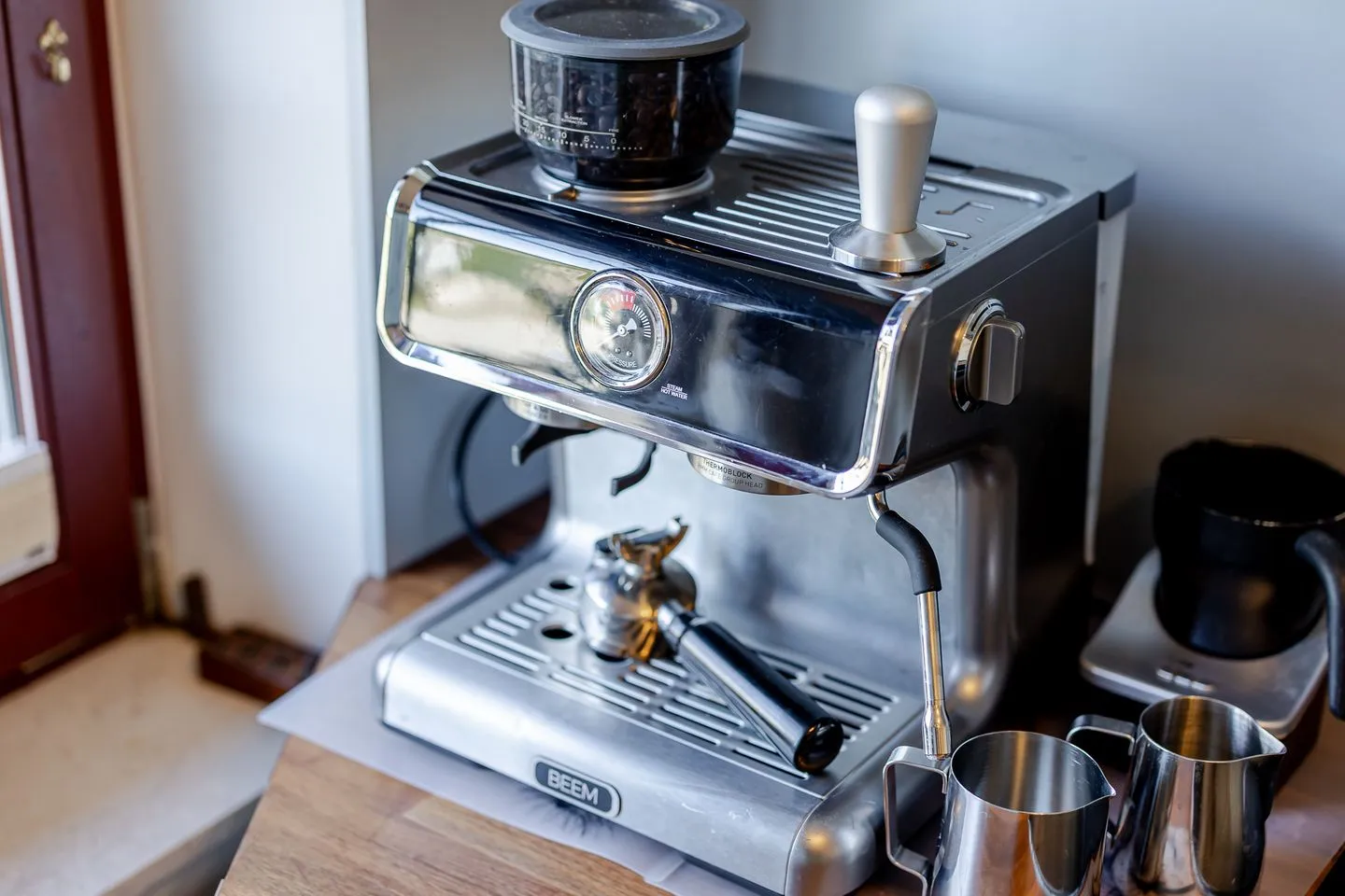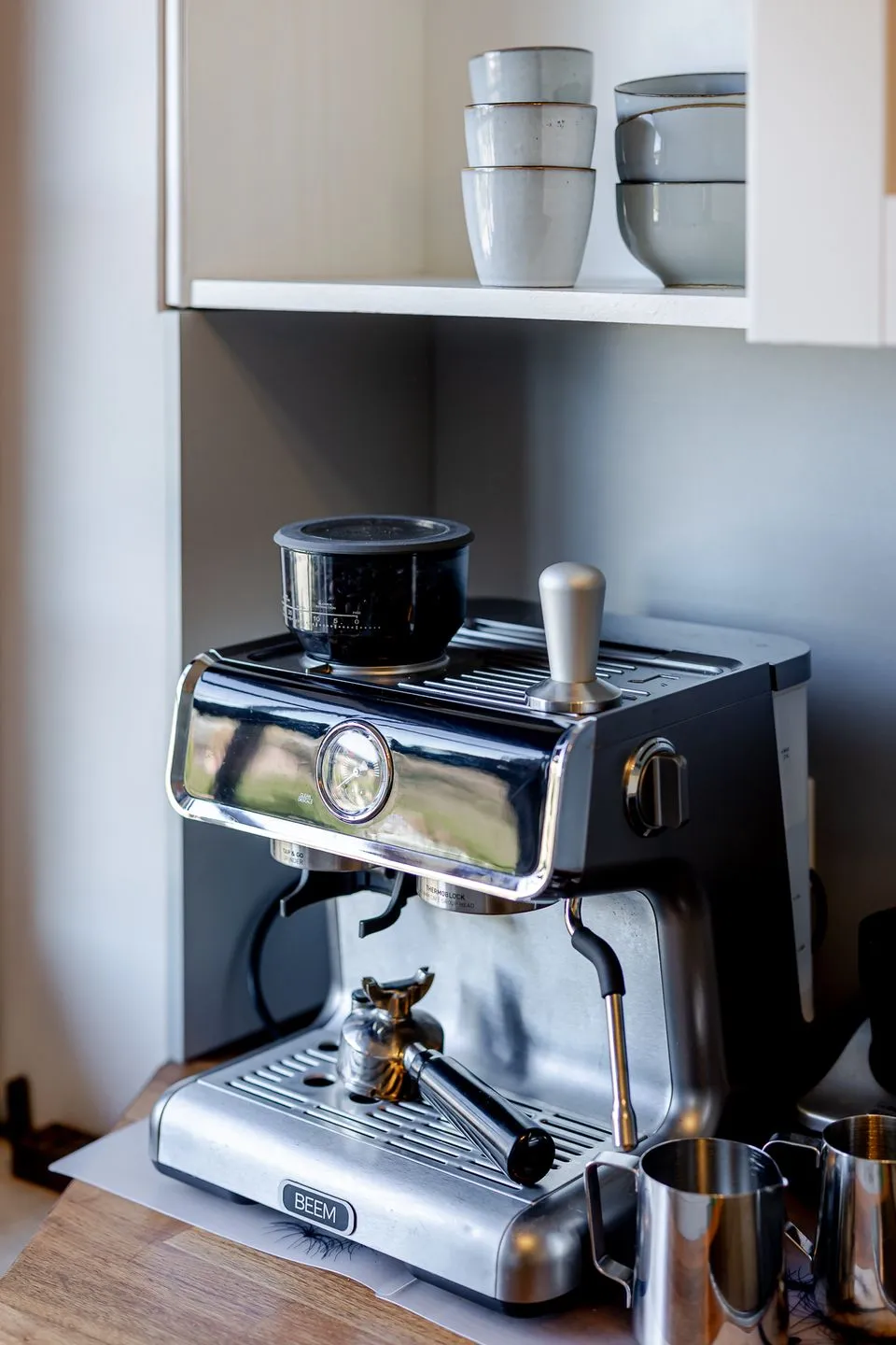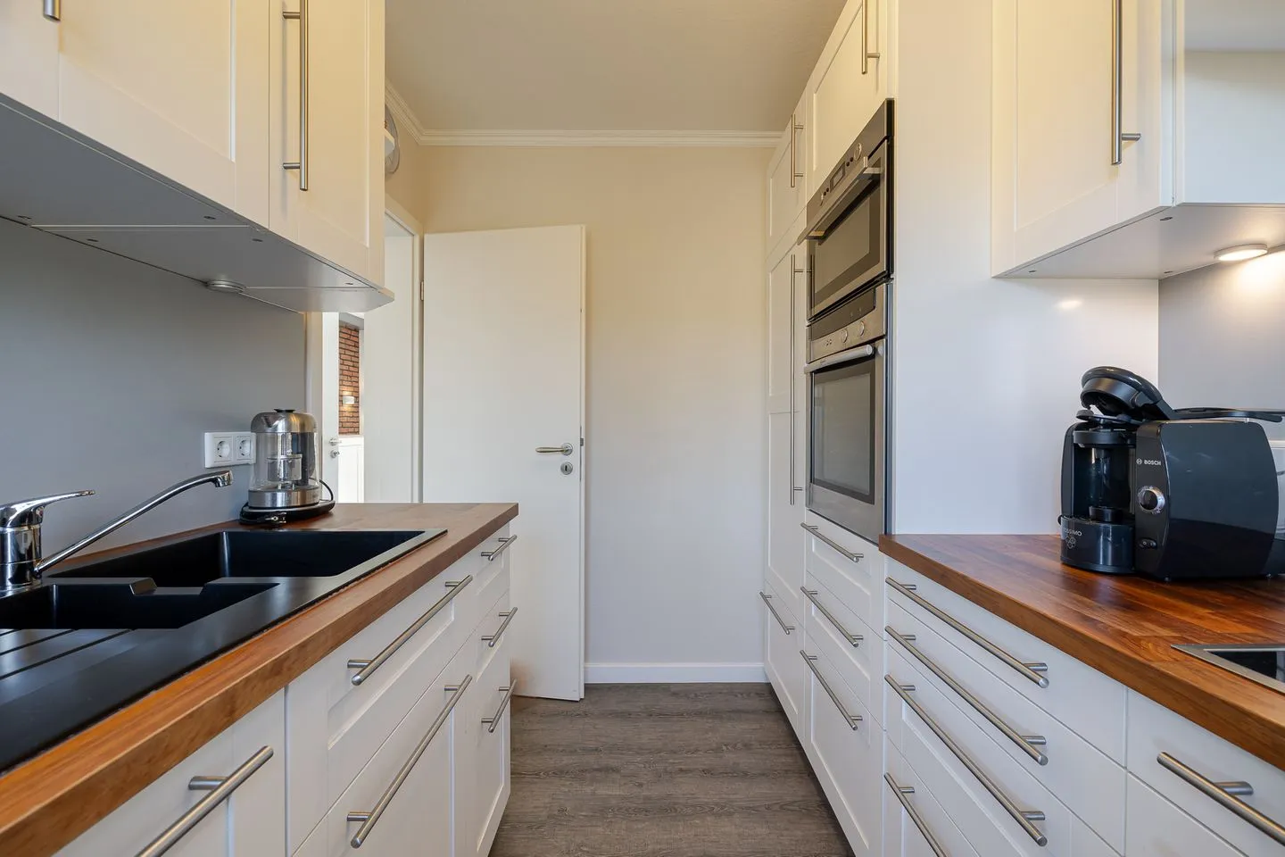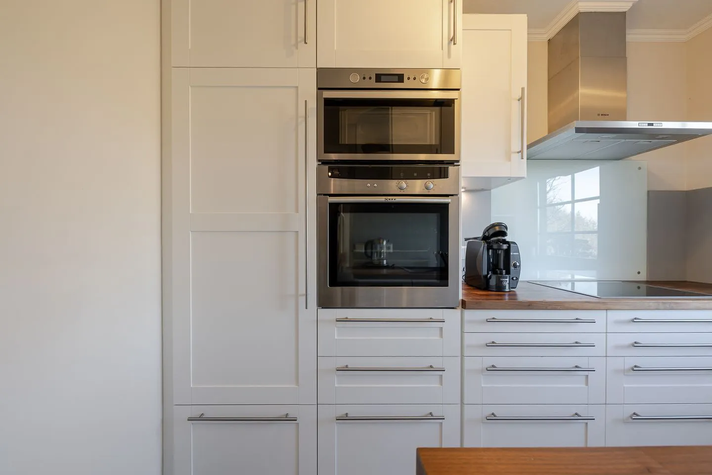 Sie ist großzügig geschnitten, verfügt über ein Fenster und ist sehr gut ausgestattet – mit Backofen, Mikrowelle, Spülmaschine und allem, was man für die Selbstversorgung braucht. Auch Kaffeeliebhaber kommen auf ihre Kosten: Neben einer klassischen Kaffeemaschine steht hier sogar eine Siebträgermaschine bereit.